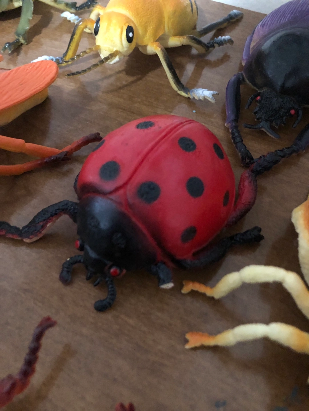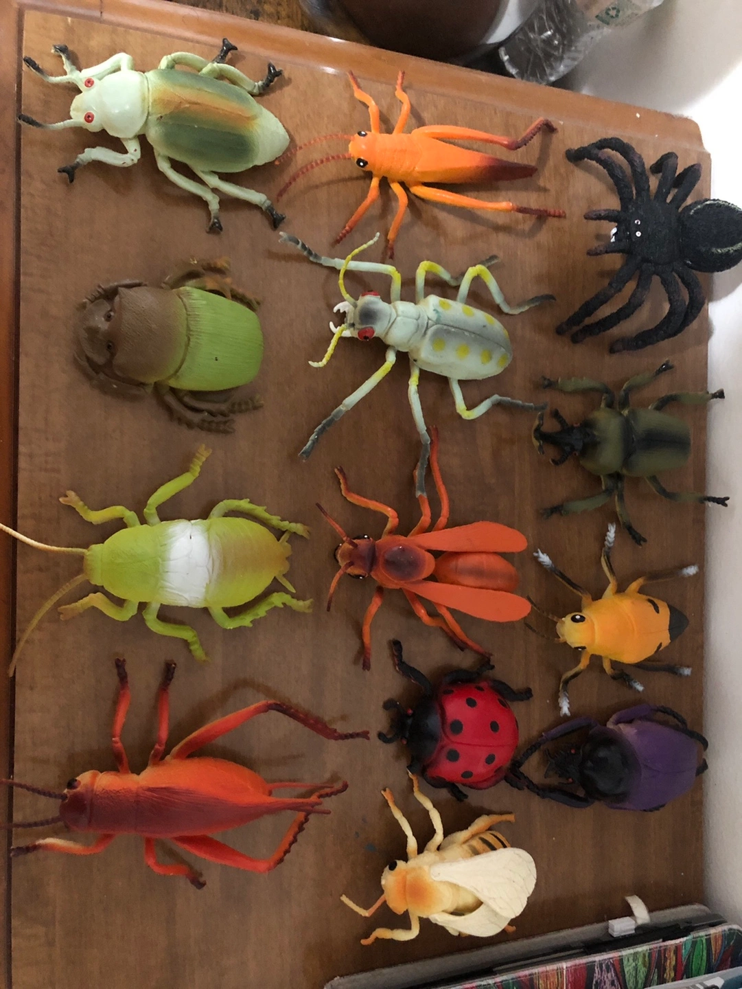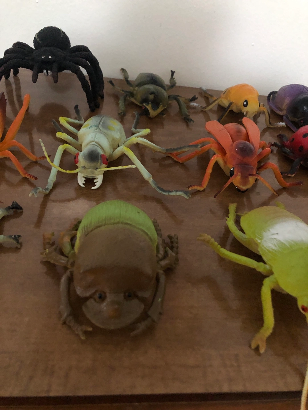 A collection of 13 plastic bug toys. Two of the bugs are missing a leg or antennae. But everything else is in good condition The bugs are various sizes, with most being around 3-4 inches in length. Sold as a set.