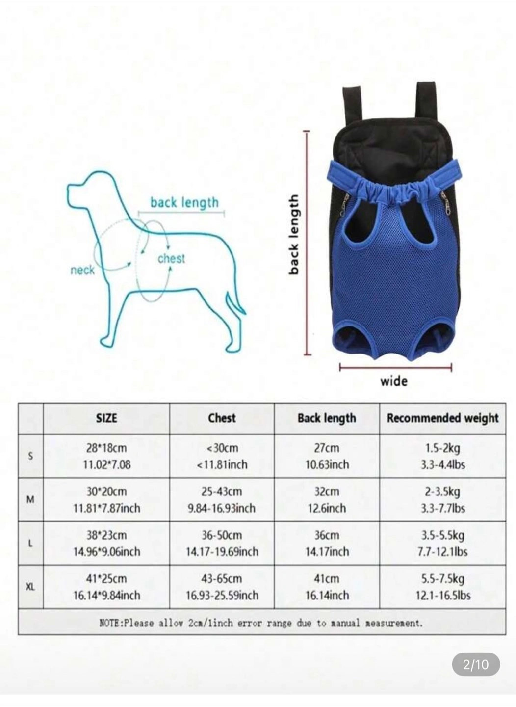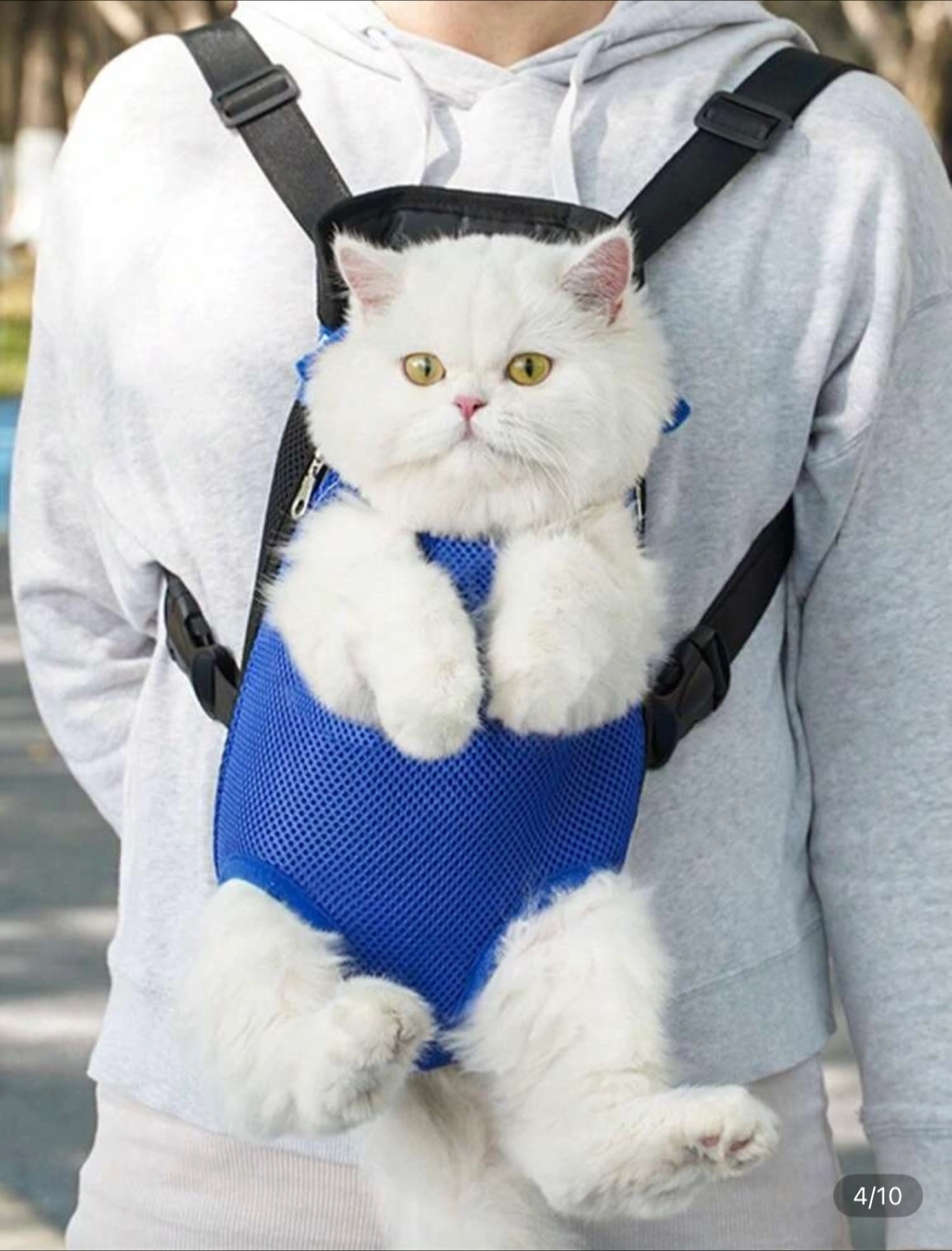 The backpack is blue and black, made with a mesh design for breathability and comfort. It has adjustable straps and is suitable for small to medium-sized pets