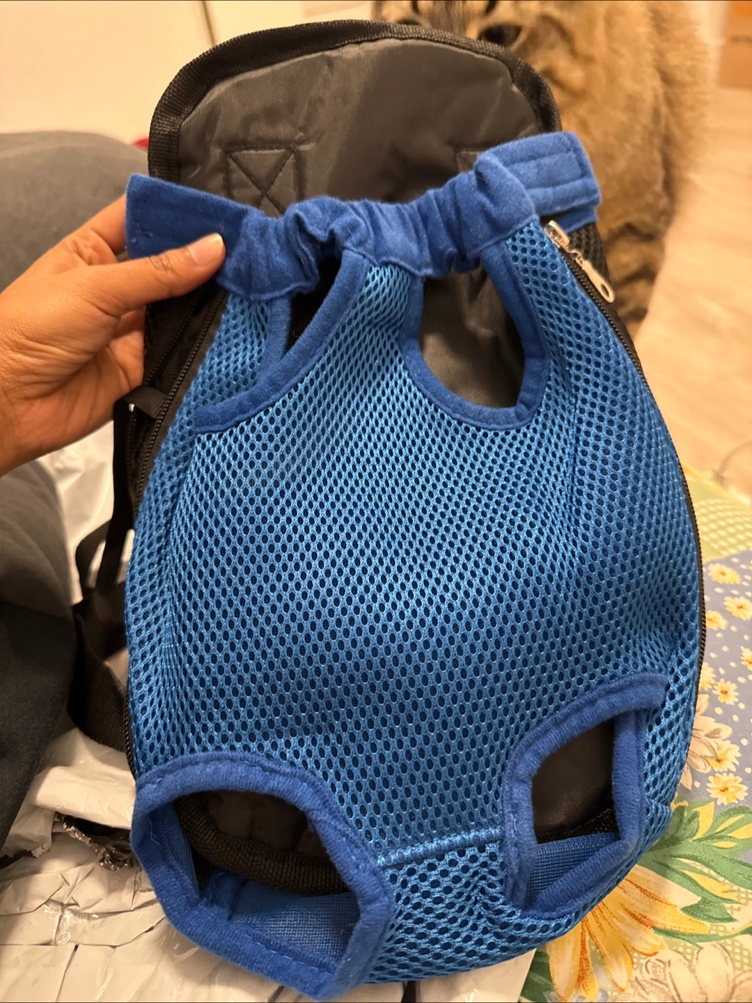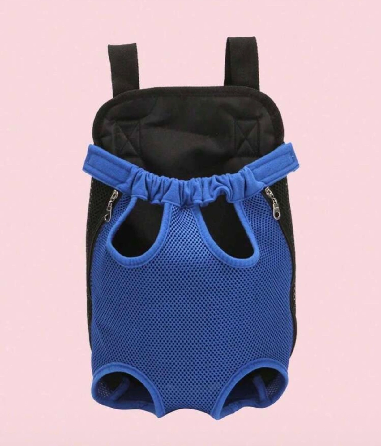 The backpack is blue and black, made with a mesh design for breathability and comfort. It has adjustable straps and is suitable for small to medium-sized pets