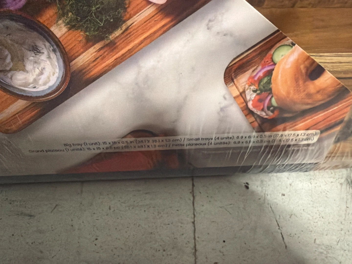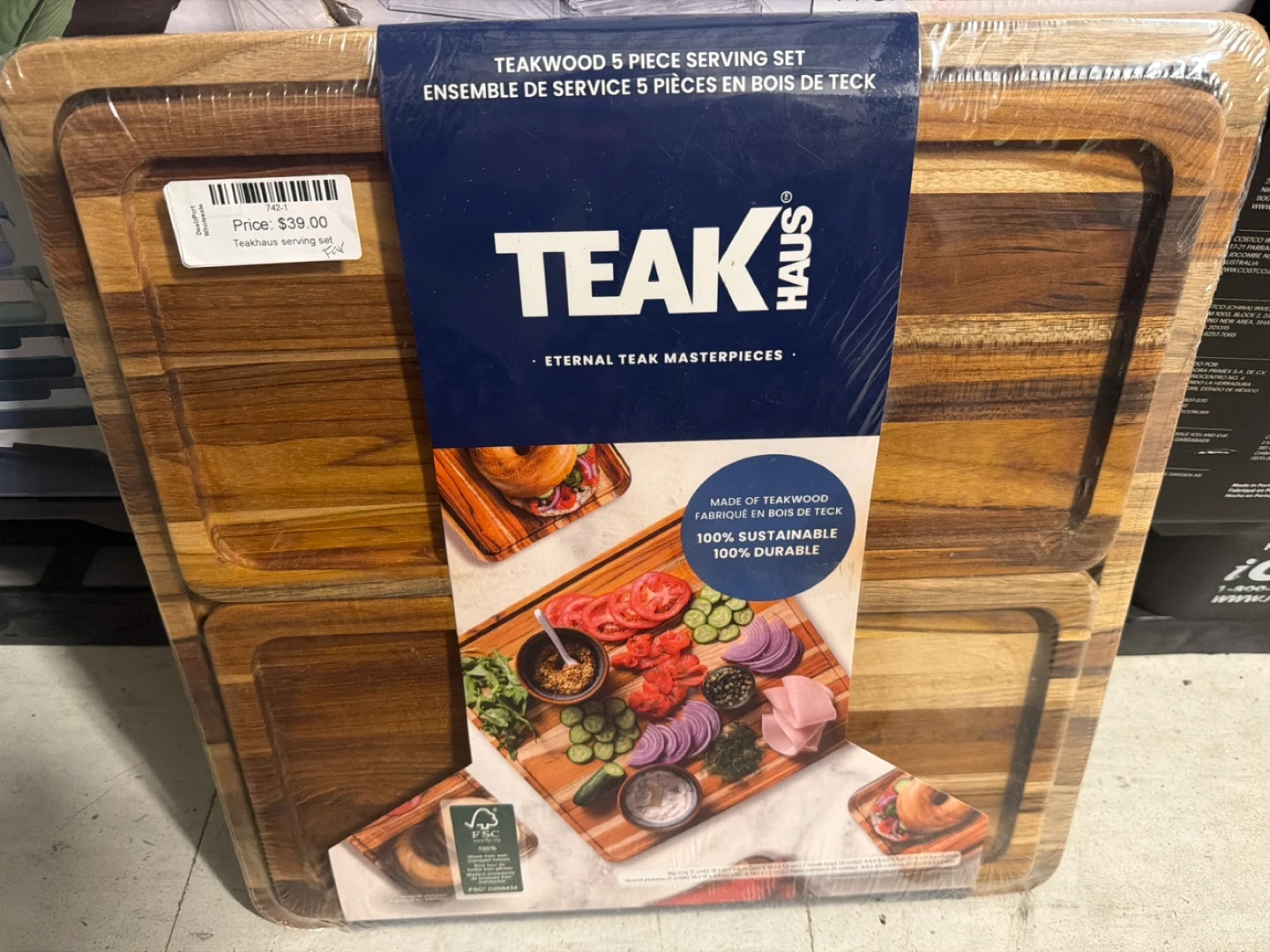 Teakwood 5 piece serving set. Made of 100% sustainable, durable teakwood. Includes one large tray (15 x 15 x 0.5 in) and four small trays (6.9 x 6 x 0.5 in).