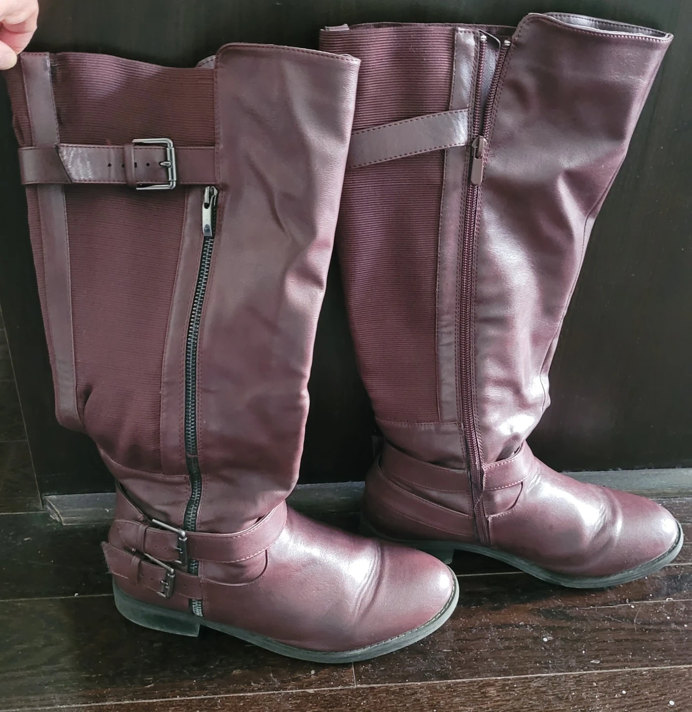 These stylish maroon knee-high boots feature a faux leather. They have a side zipper for easy on and off.