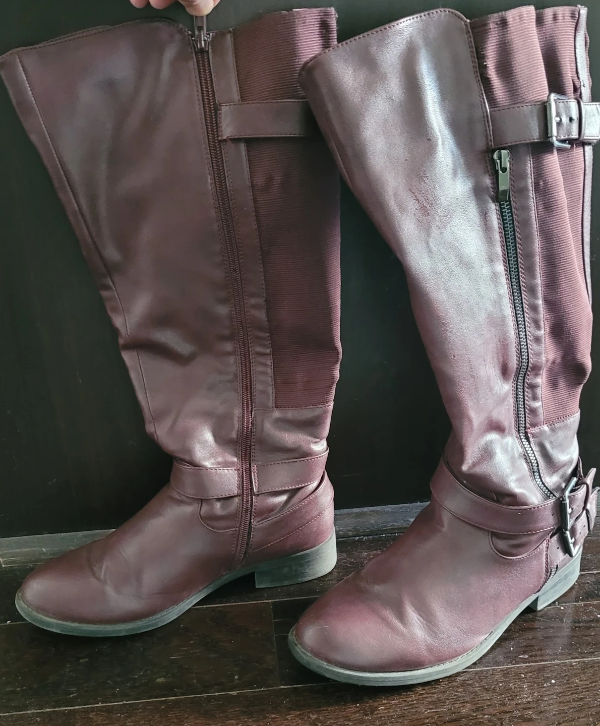 These stylish maroon knee-high boots feature a faux leather. They have a side zipper for easy on and off.