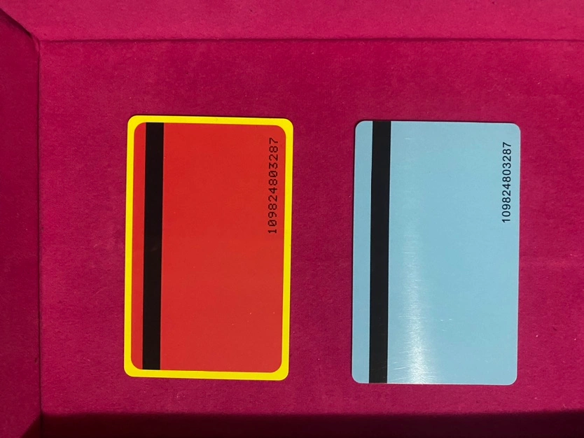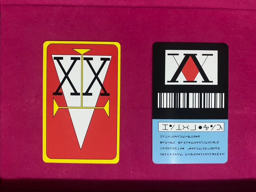 One is red with the symbol for the Hunter Exam and the other is blue with the Hunter Association logo. The back side has the card number for the Hunter Exam. The cards are both in the same condition as pictured.
