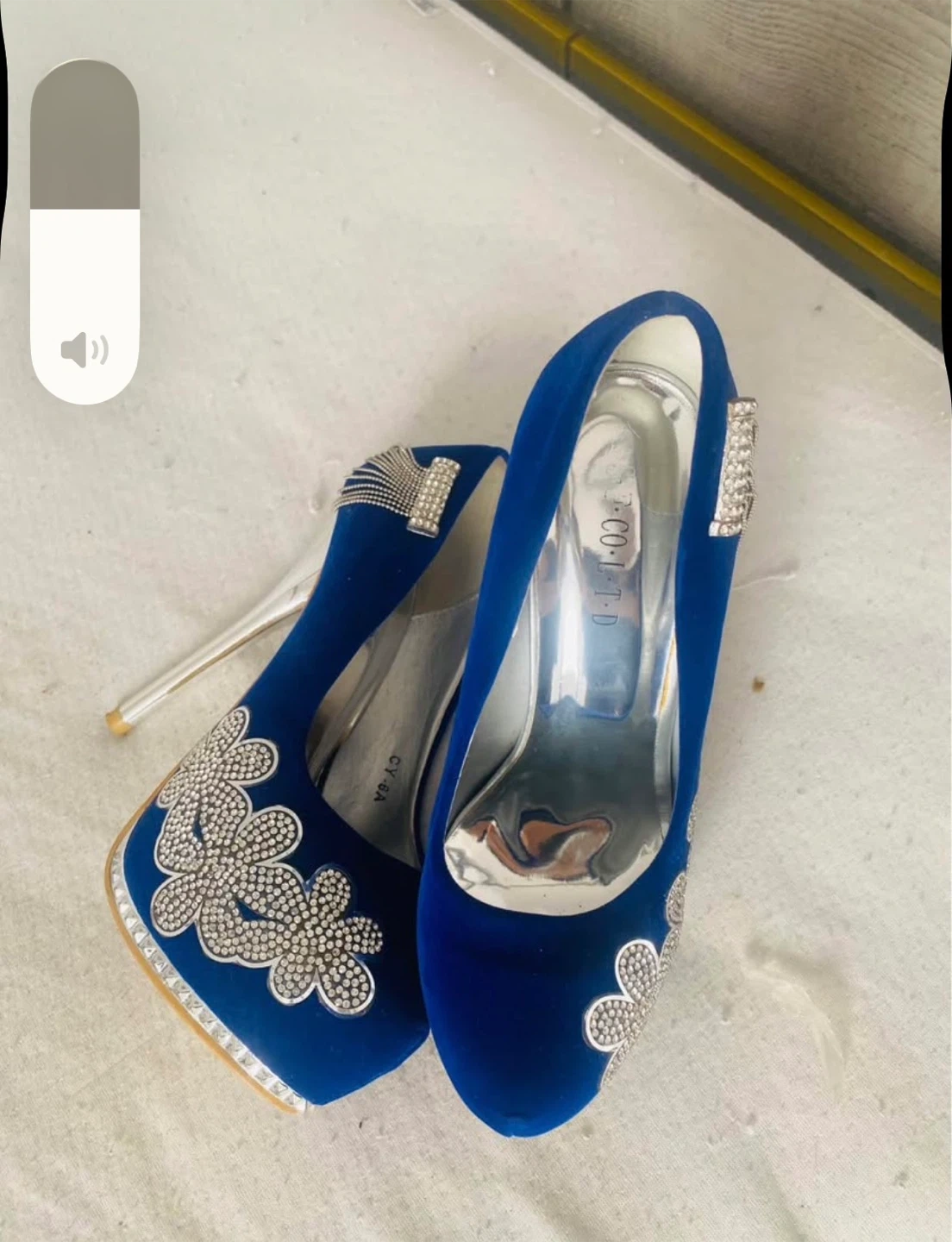 These striking blue velvet high heels feature intricate rhinestone floral appliques and shimmering fringe detail on the back. They have a comfortable platform sole and a sleek silver stiletto heel. Perfect for special occasions or adding some glamour to your outfit!