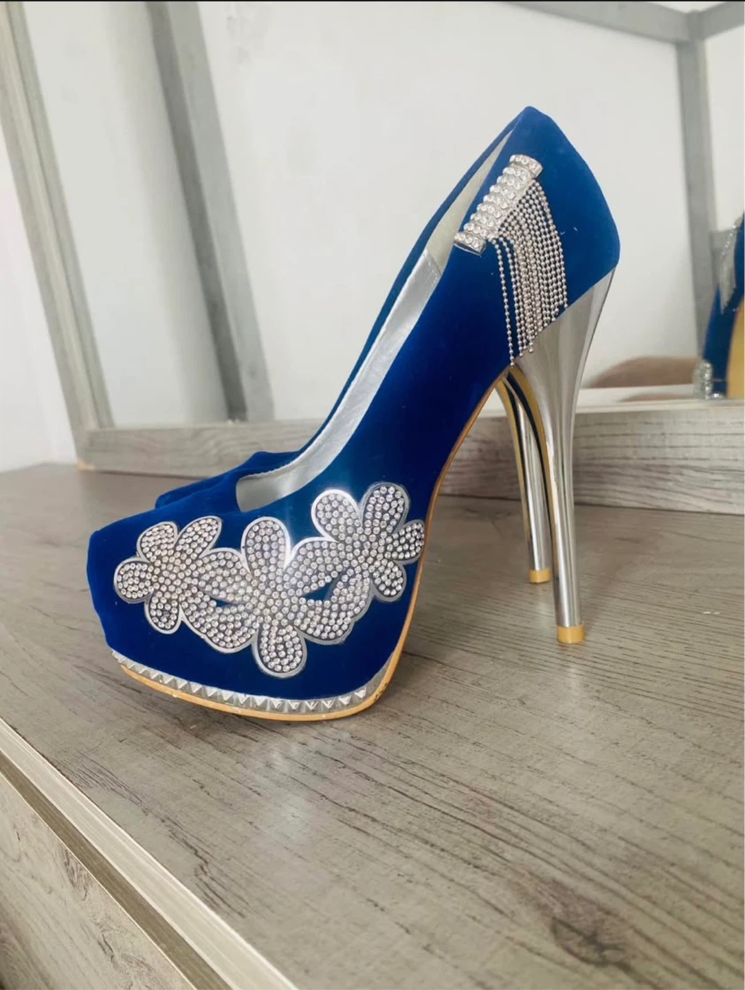 These striking blue velvet high heels feature intricate rhinestone floral appliques and shimmering fringe detail on the back. They have a comfortable platform sole and a sleek silver stiletto heel. Perfect for special occasions or adding some glamour to your outfit!