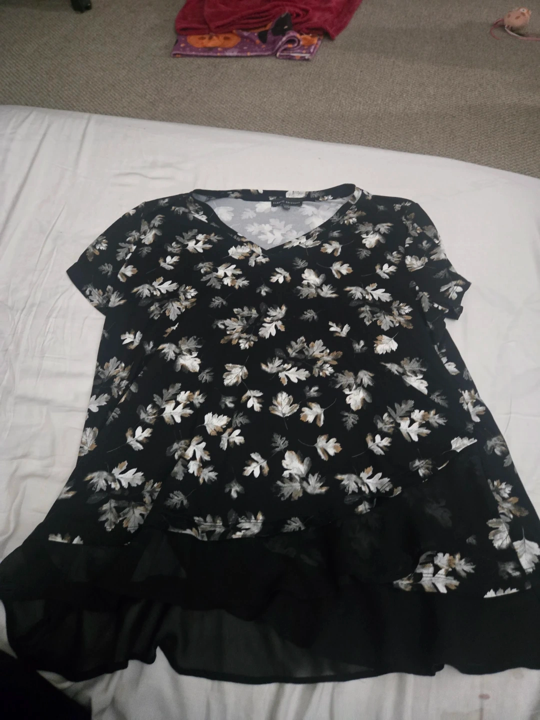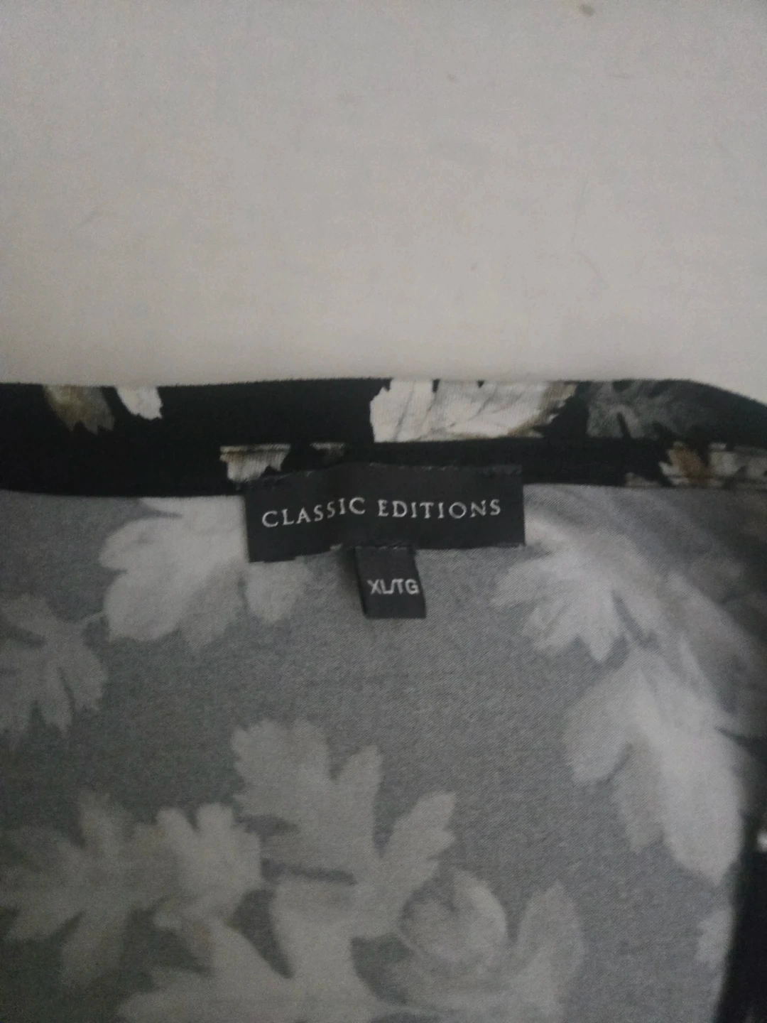 This is a women's short-sleeve top from Classic Editions. It features a black background with a white and grey floral leaf print. The hem has a sheer black overlay.