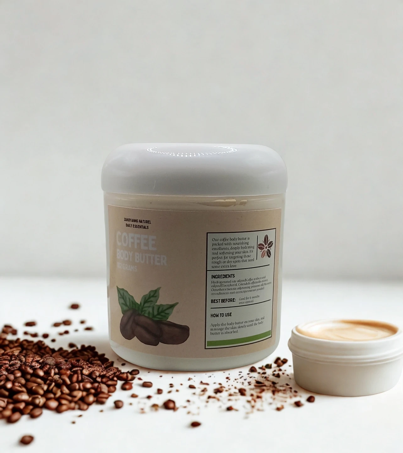 Our fragrance - free coffee body butter made with coffee arabica seed oil and Hydrogenated soy oil with tocopherol(Vitamin E) deeply hydrates and revitalizes your skin. It's perfect for targeting dry patches and leaving your skin with a smooth feel. Apply the body butter to your skin and let it absorb. Use within 6 months of opening.