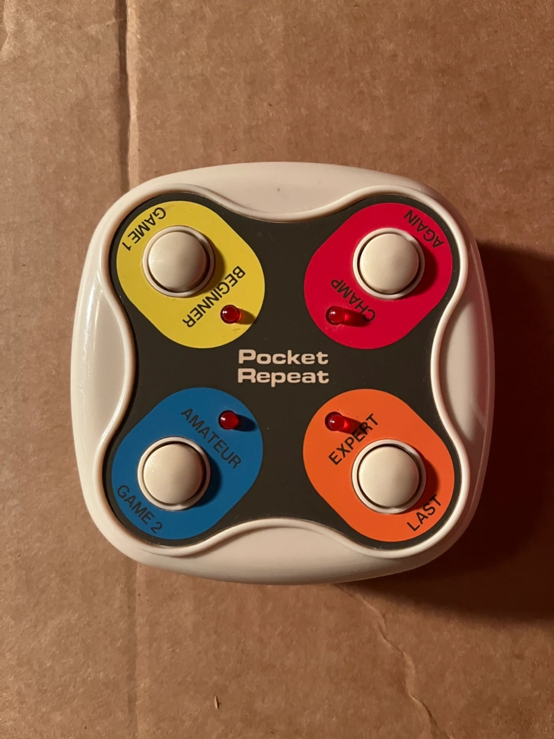 A portable memory game, batteries not included. It has four different modes: Beginner, Champ, Amateur, and Expert. It's in great condition and ready for a new player!