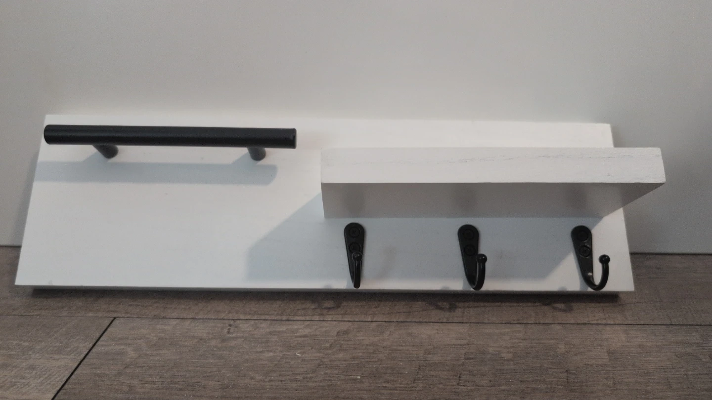 This wall shelf features a clean white finish and includes a small ledge for display. It's equipped with a black handle and three black hooks for hanging items. Perfect for entryways or kitchens!