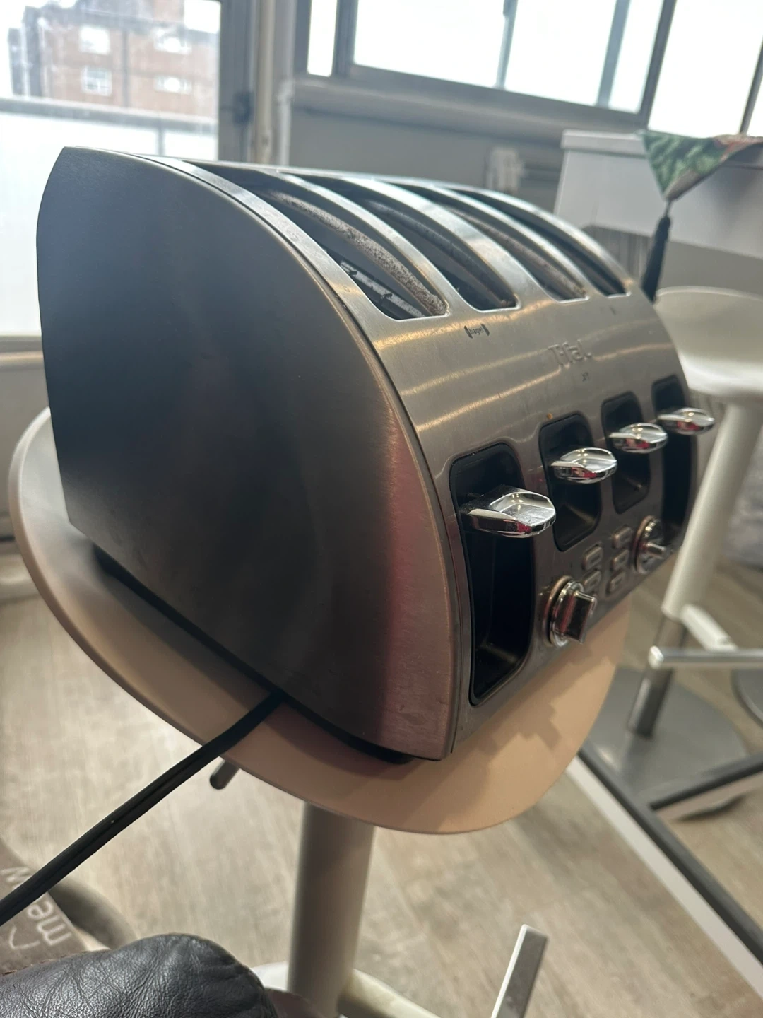 This T-fal toaster has a brushed stainless steel finish. It's a 4-slice model with reheat and bagel settings. Multiple browning levels are available.