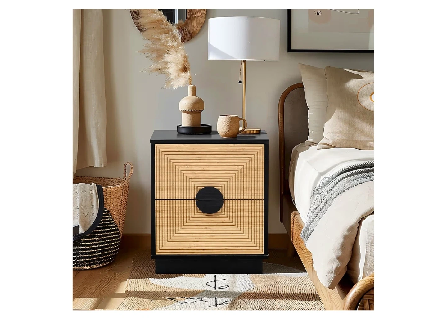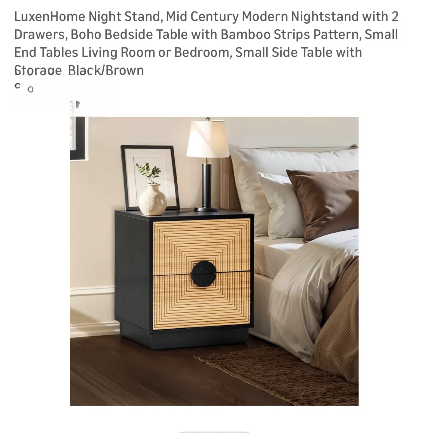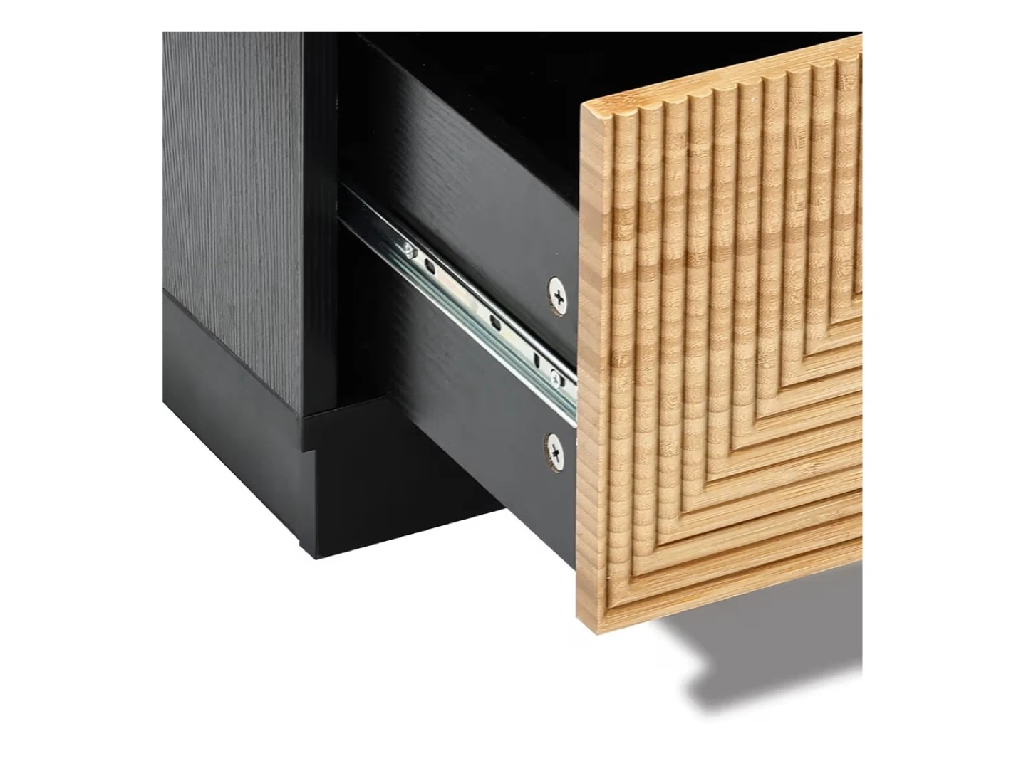 This night stand features a black finish with a bamboo strip pattern on the drawer fronts and two drawers for storage. Drawer slides are metal for smooth operation. It's a stylish addition to any bedroom.