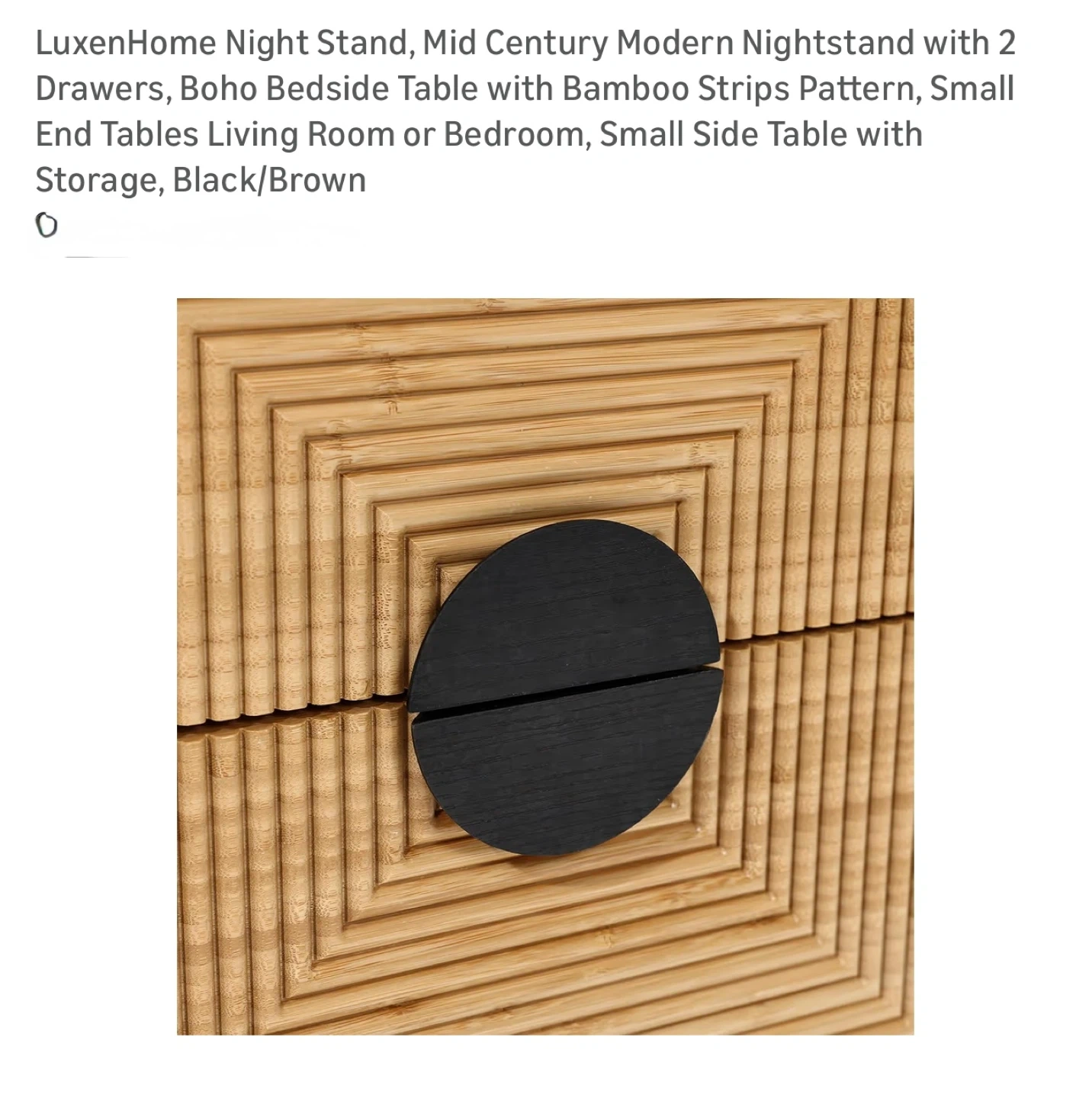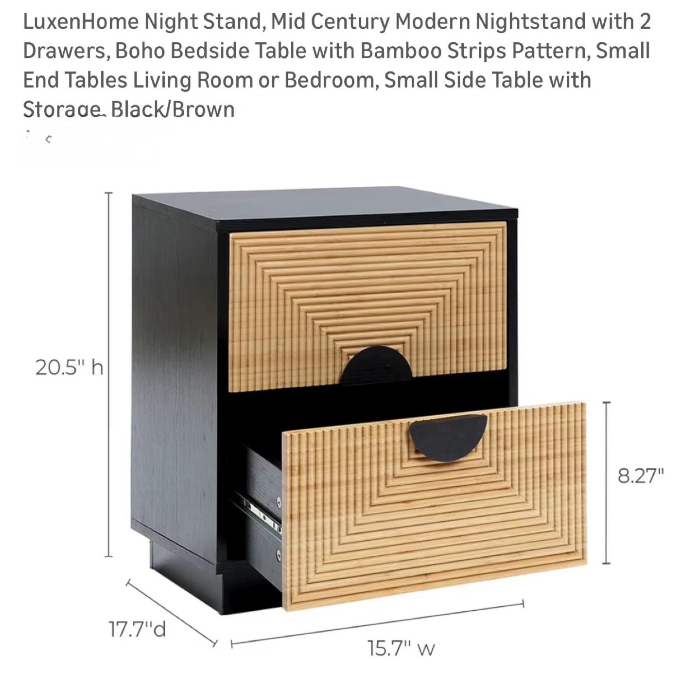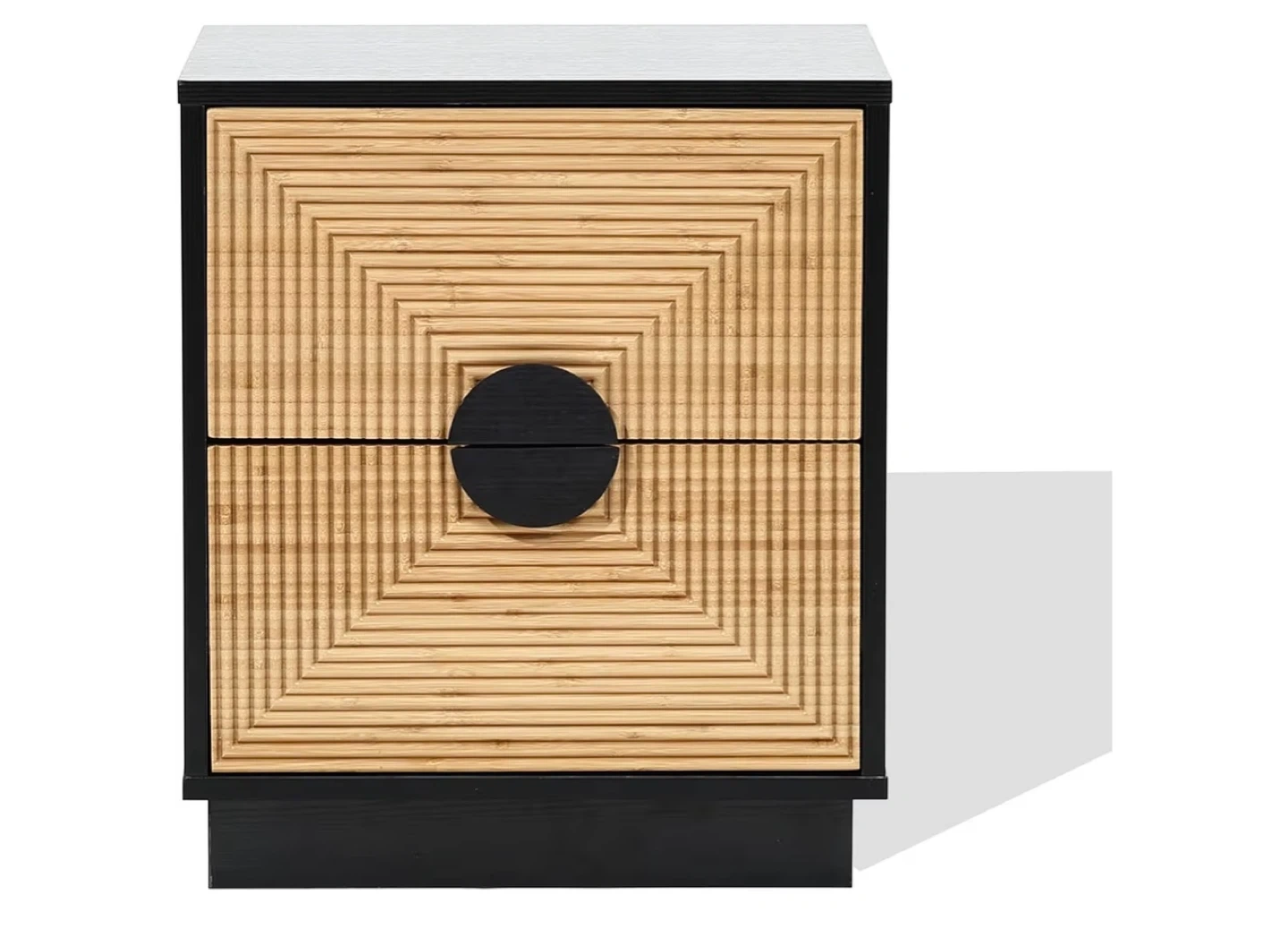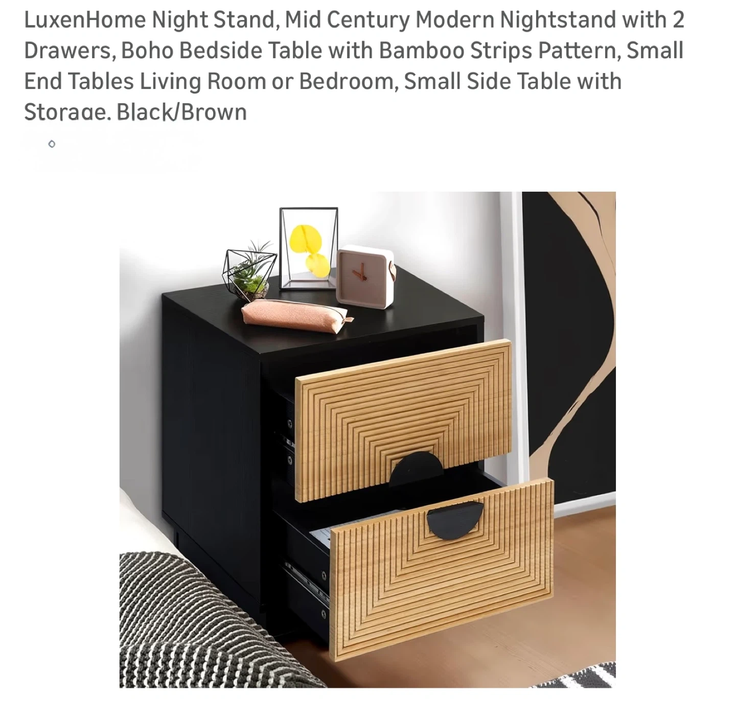 This night stand features a black finish with a bamboo strip pattern on the drawer fronts and two drawers for storage. Drawer slides are metal for smooth operation. It's a stylish addition to any bedroom.