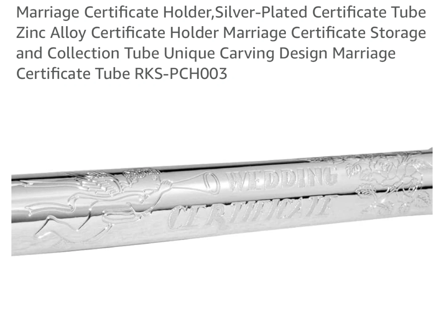 Selling a silver-plated certificate tube for wedding certificates. It features a unique carving design. It's made from zinc alloy and comes in its original box for safekeeping