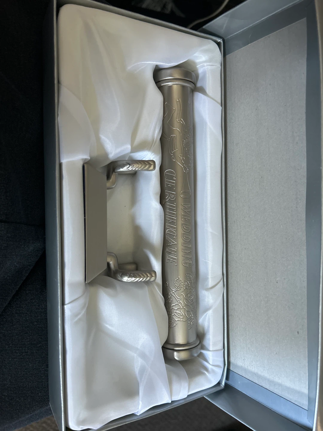 Selling a silver-plated certificate tube for wedding certificates. It features a unique carving design. It's made from zinc alloy and comes in its original box for safekeeping