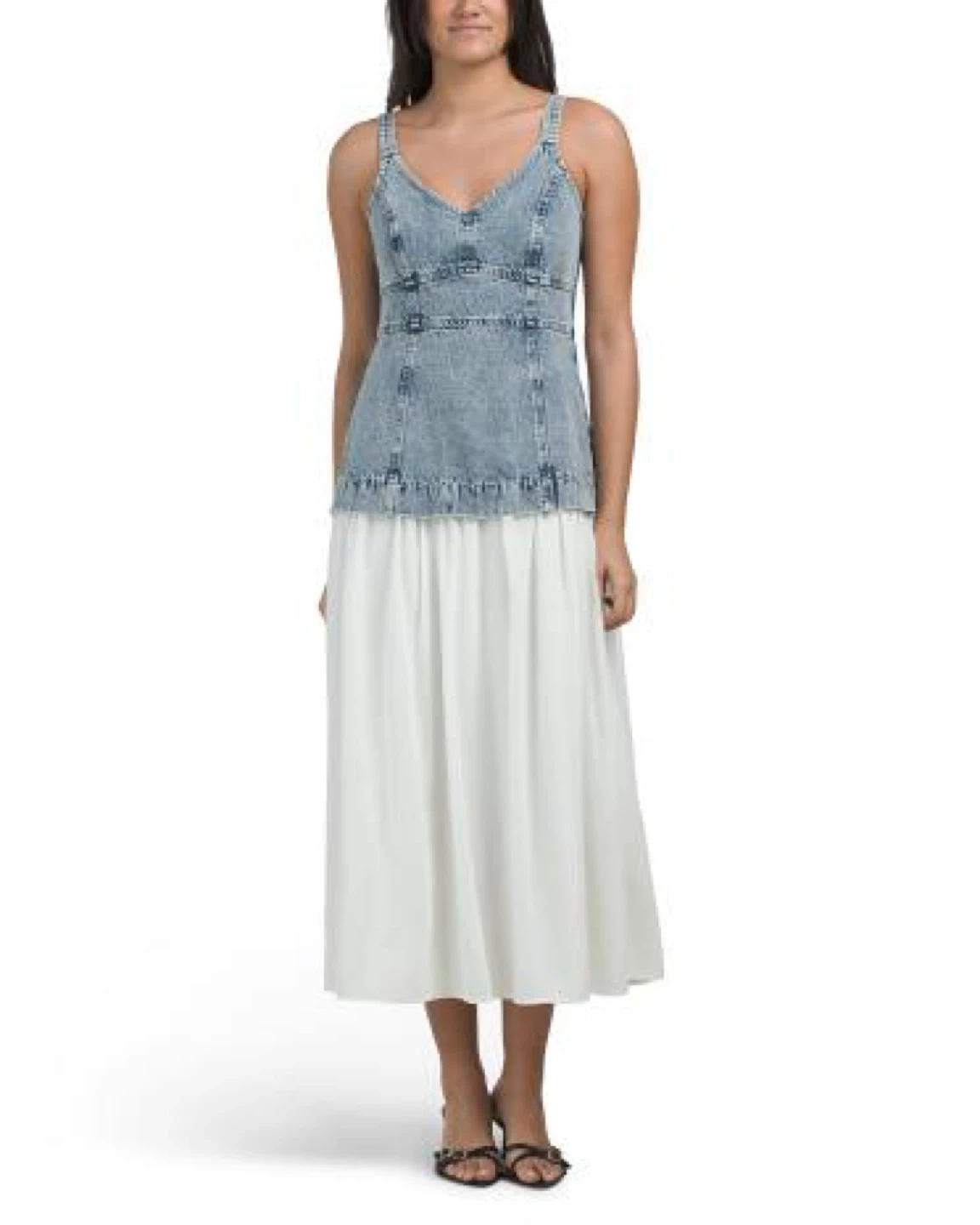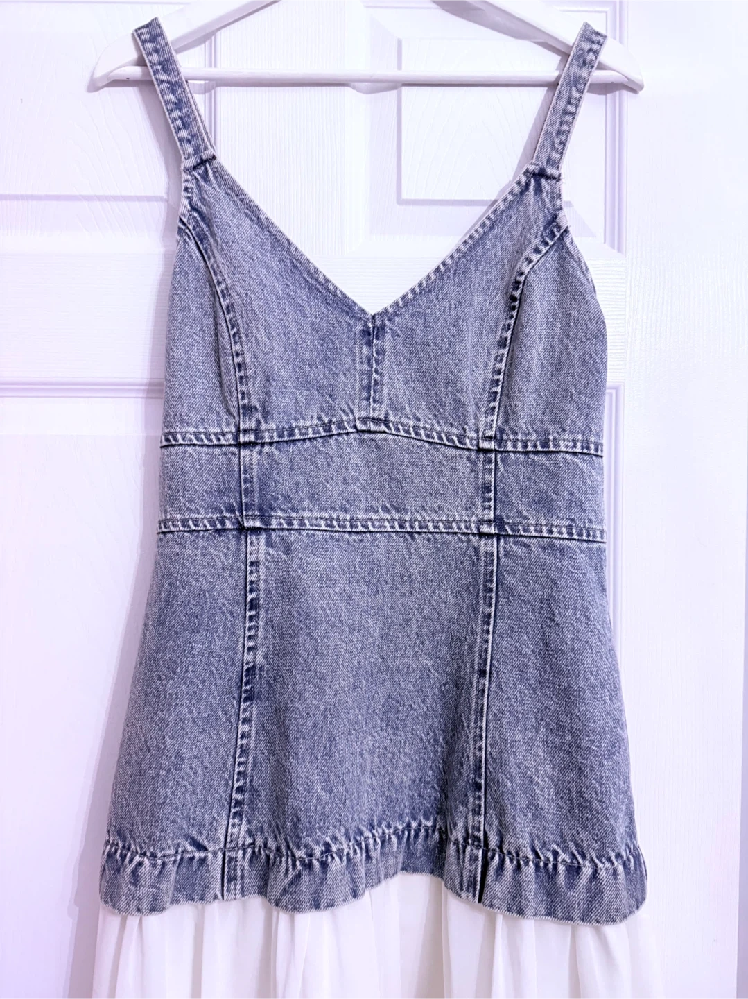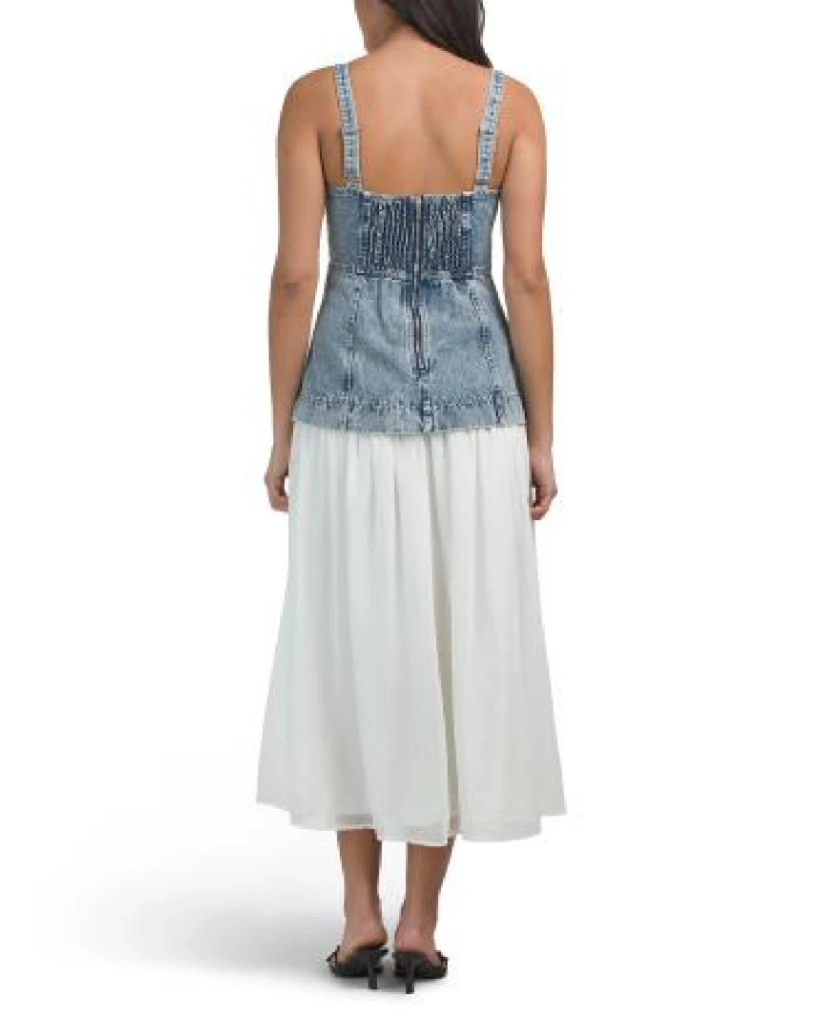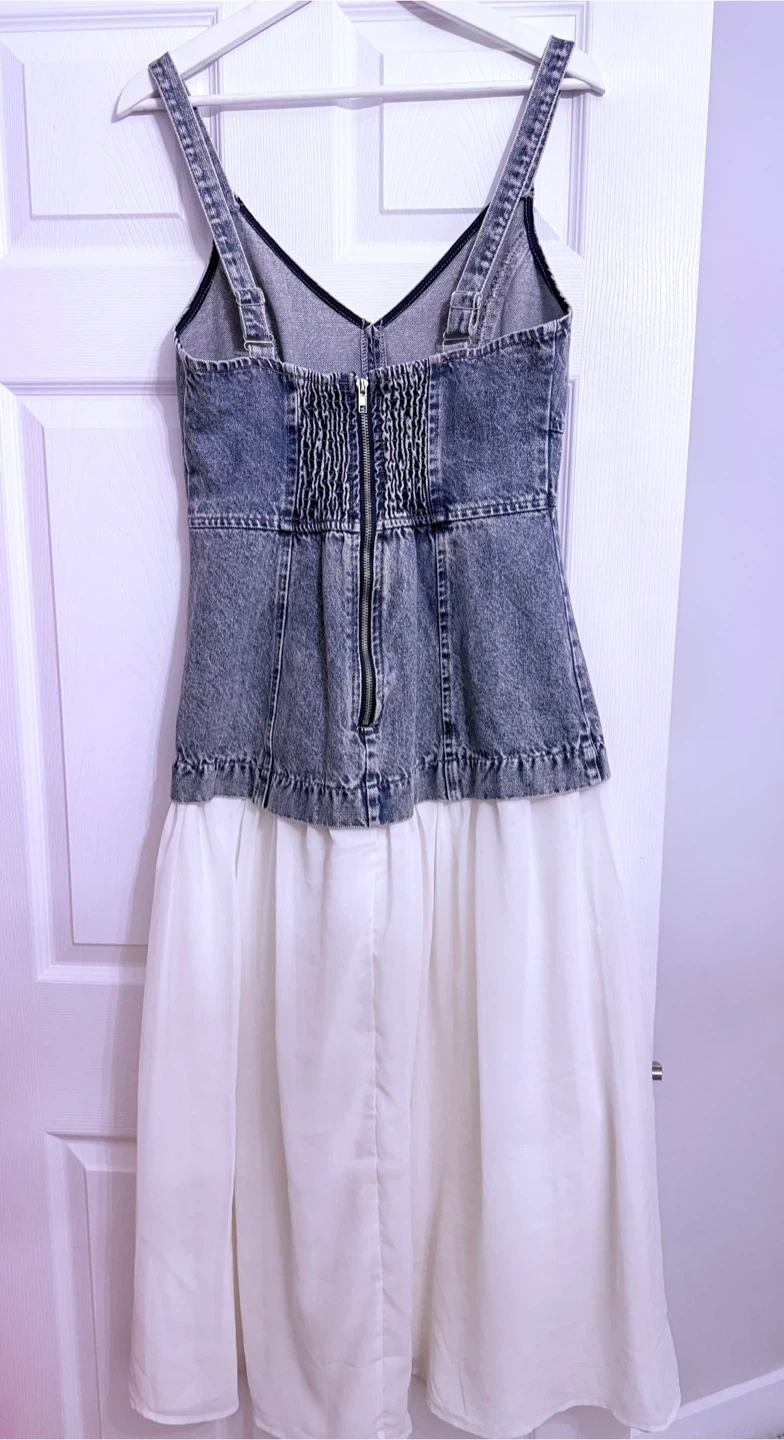 This dress features a distressed denim bodice with a smocked back and a flowy white chiffon skirt. It has adjustable spaghetti straps and a zipper closure. Perfect for a casual summer day!