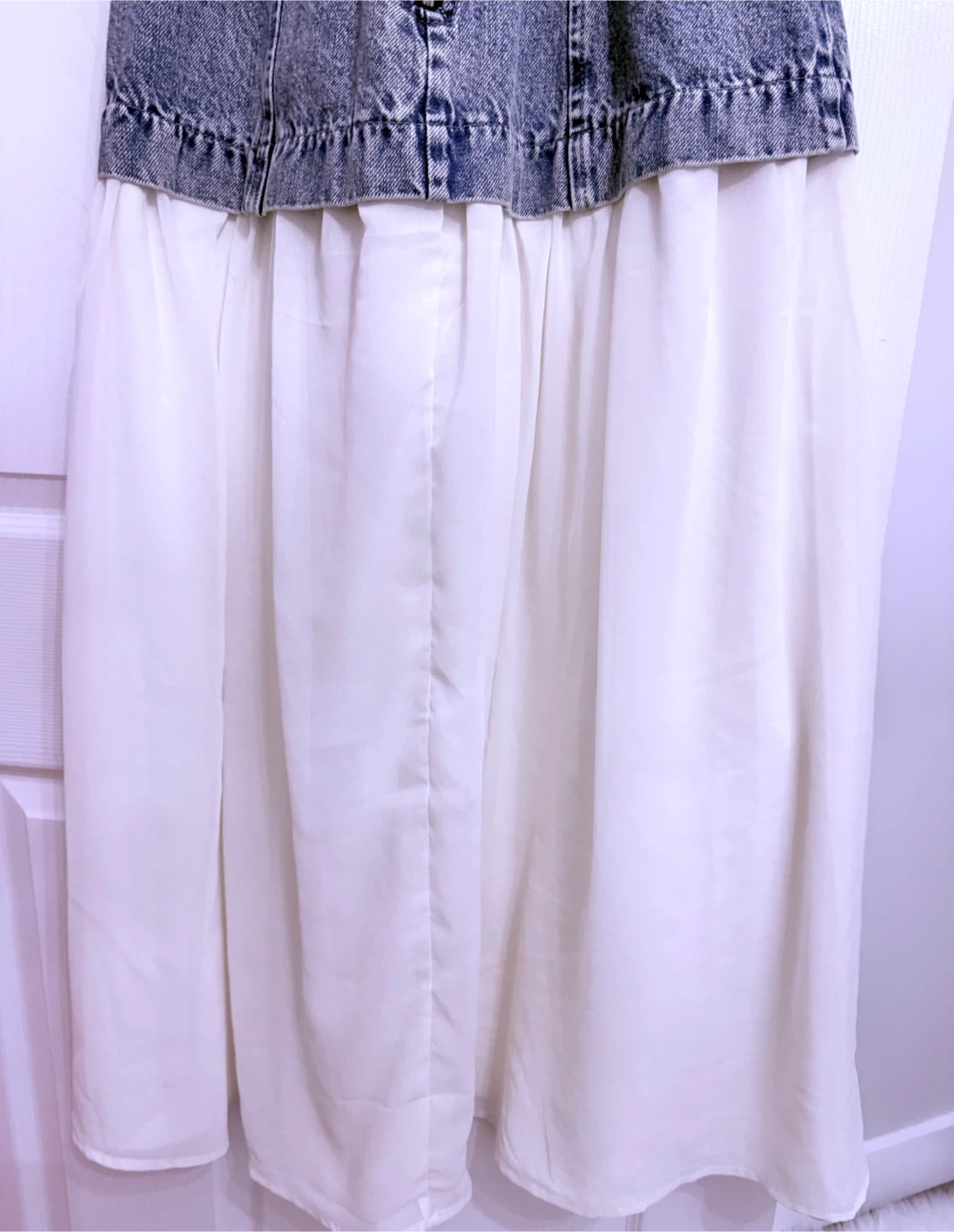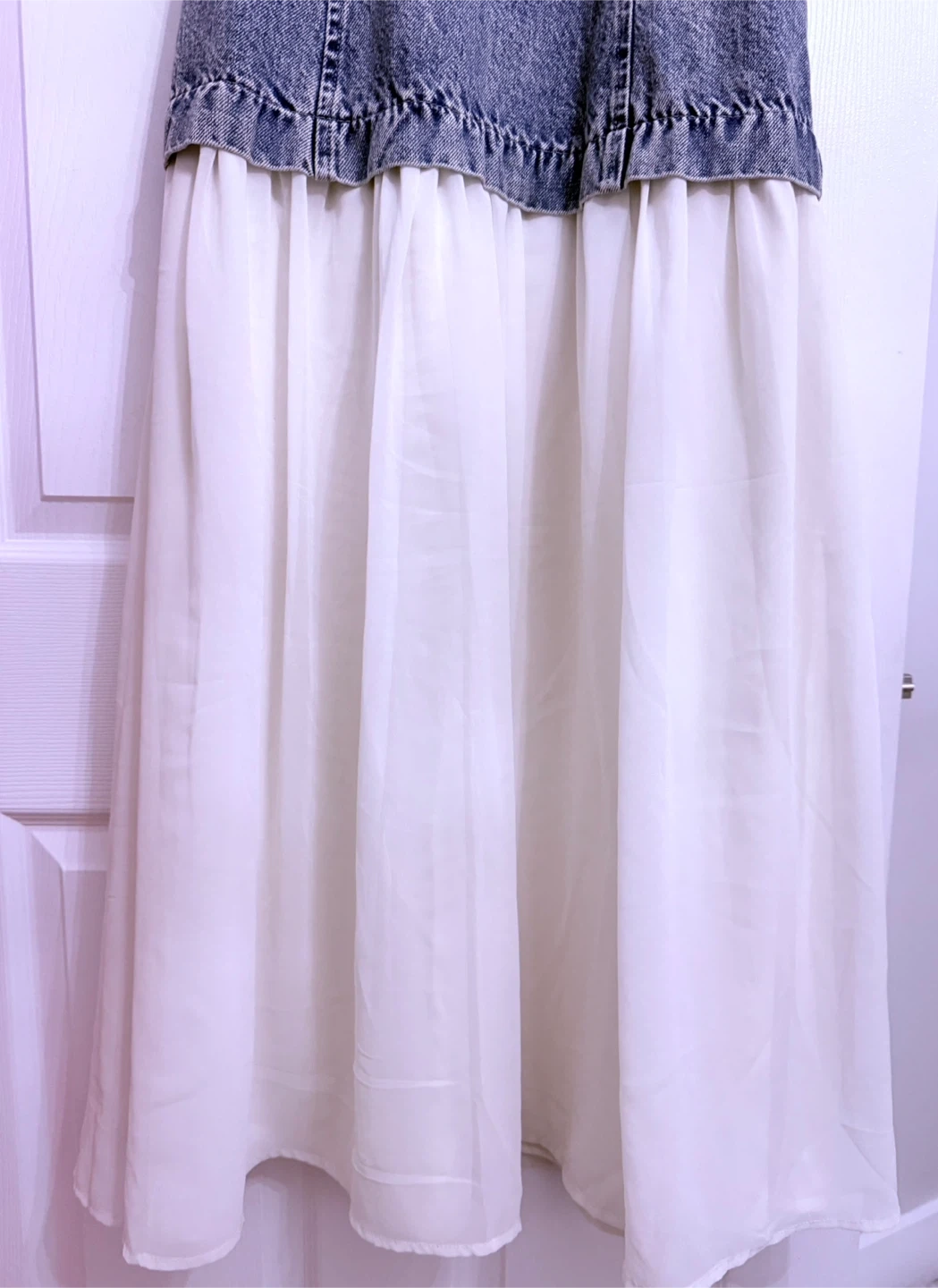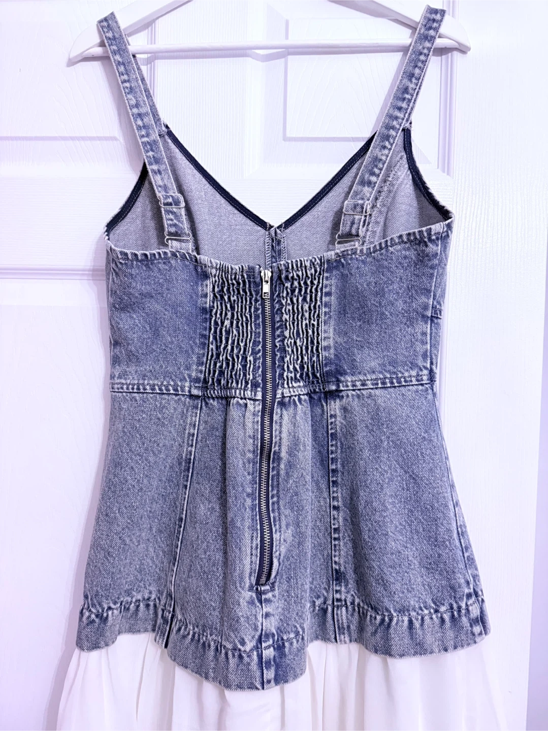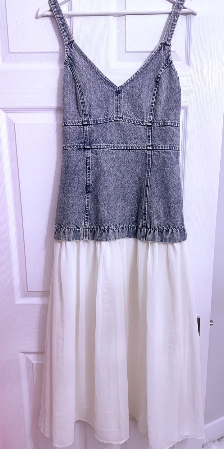 This dress features a distressed denim bodice with a smocked back and a flowy white chiffon skirt. It has adjustable spaghetti straps and a zipper closure. Perfect for a casual summer day!