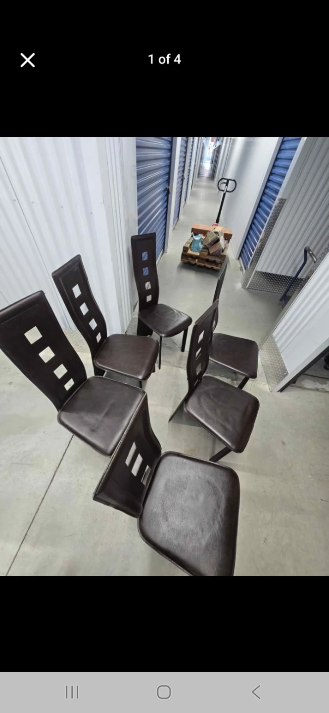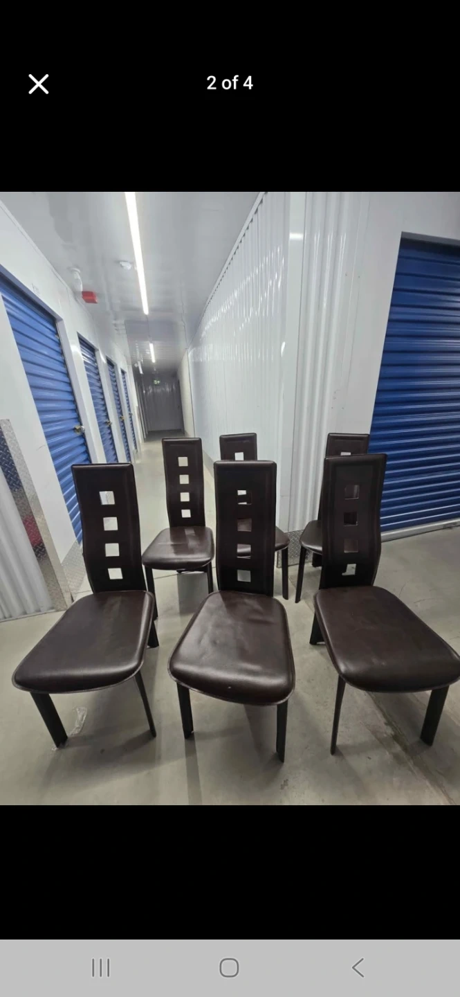 Six dark brown dining chairs with modern square cut-outs in the backrests. The set includes a large marble-patterned table top and four dark wood table legs. This dining set is ready for a new home table is bit lose its free only chairs are 90$