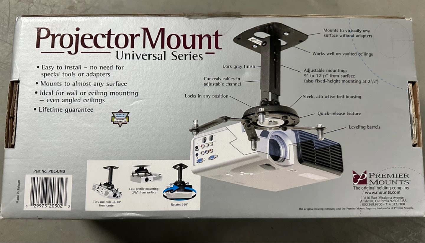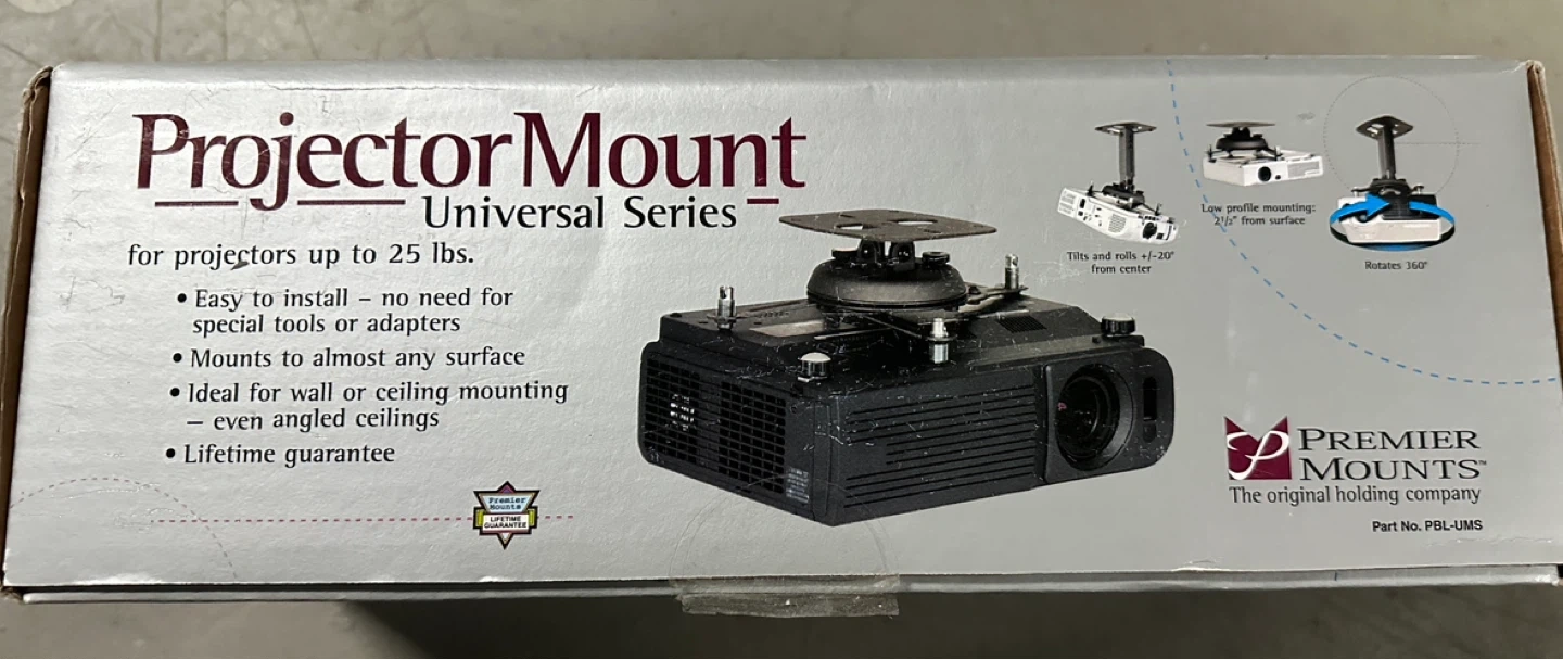 This is a Premier Mounts Universal Series projector mount. It's designed for projectors up to 25 lbs. Mounts to virtually any surface, works well on vaulted ceilings and includes leveling barrels. (If you need two, I have extra one. Same it is new. Price will be x2)