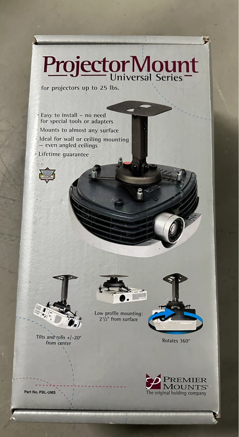 This is a Premier Mounts Universal Series projector mount. It's designed for projectors up to 25 lbs. Mounts to virtually any surface, works well on vaulted ceilings and includes leveling barrels. (If you need two, I have extra one. Same it is new. Price will be x2)