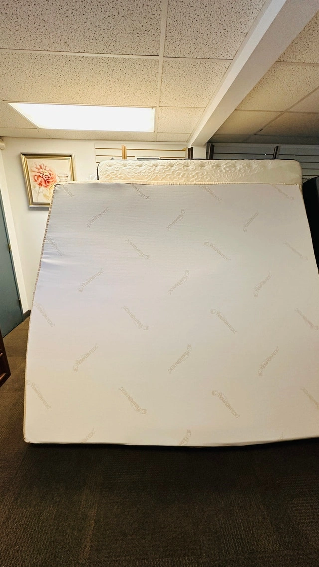 Mattresses have never been slept on and were used for home staging only. They are clean, have been stored in thick plastic mattress bags, and are ready to be loaded. There might be the odd drag mark or bit of dust from the mattress bag, but I will disclose this and post pictures. All sizes of box springs and metal bed frames are also available. Come down and take a look in person. I have them stored at a warehouse in St. Albert. Pick up is in St. Albert and by appointment only. Please message to arrange a time and day that works for you.
