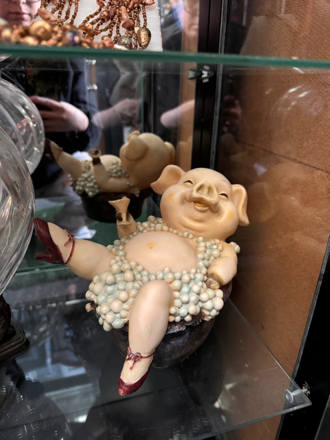 This charming figurine features a happy pig character lounging in a bath of bubbly beads. It's wearing adorable red heels. A delightful decorative piece for any shelf or table!