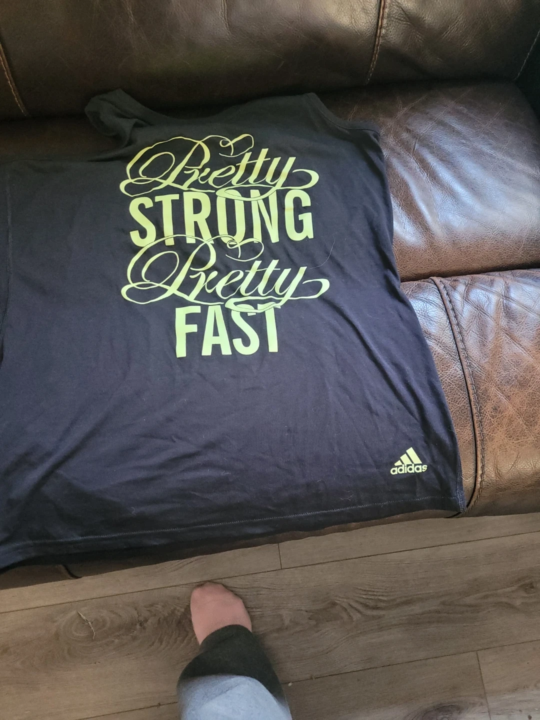 This is an Adidas black t-shirt with "Pretty Strong Pretty Fast" graphic print. It's a comfortable and stylish top. Perfect for workouts or casual wear!