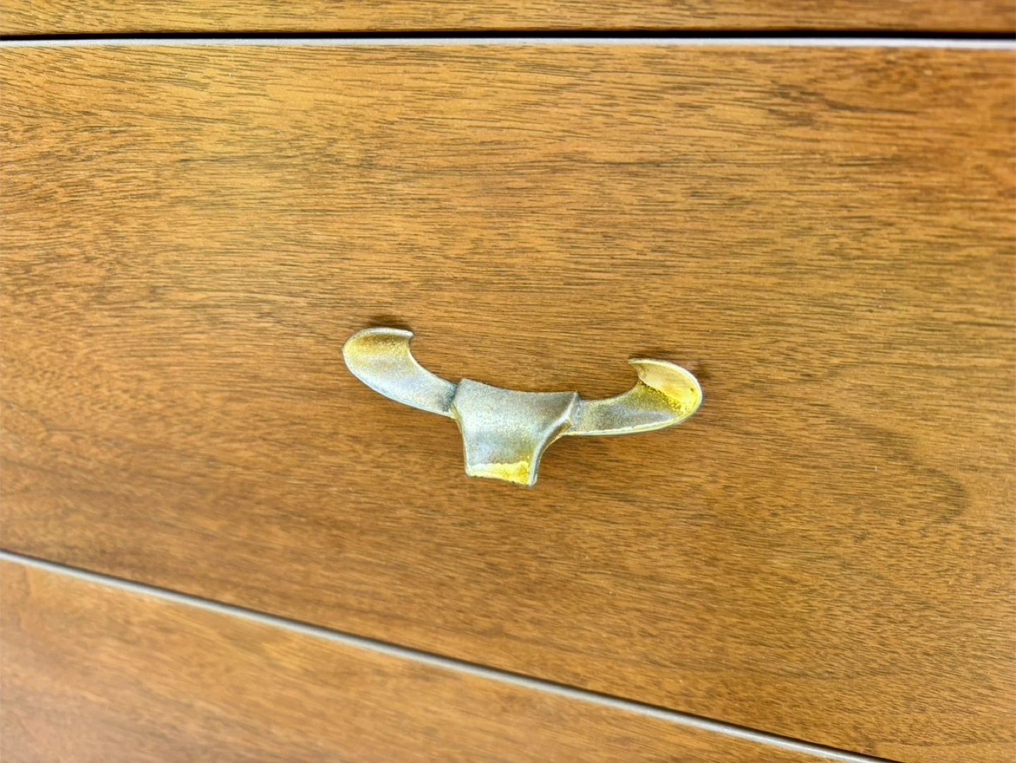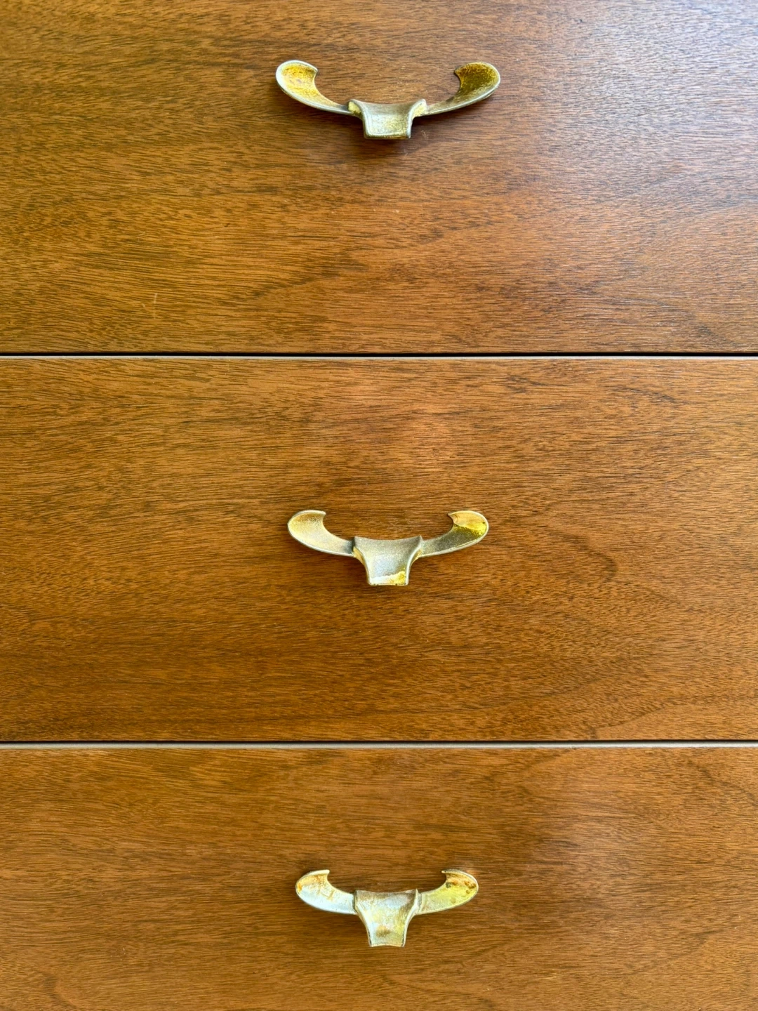 Stunning, authentic mid-century modern (MCM) lowboy dresser. Walnut and heavy. This is a high-quality, solid wood piece with classic clean lines, tapered legs, and original unique brass "wishbone" or "crown" hardware (drawer pull)