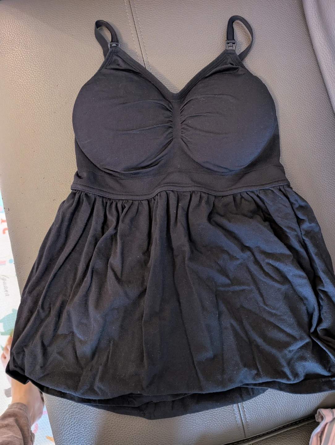 This is a black nursing tank top with adjustable straps and a ruched bust. It's made of a soft, stretchy material. The flowy bottom offers comfort and coverage.