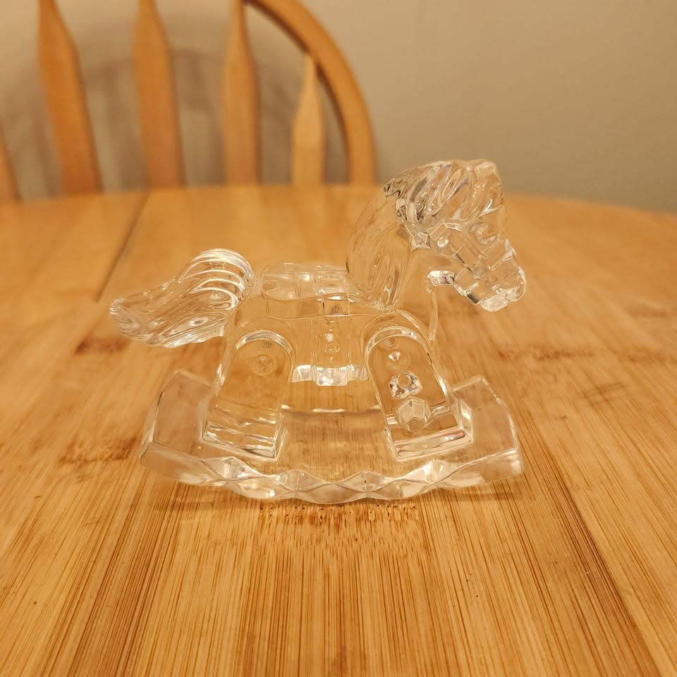 This rocking horse is smooth to touch and in wonderful condition. There are no chips, cracks or scratches. It may be crystal, it may be art glass, but whichever it is, it's a great accent to the decor in the nursery, or elsewhere in your living area. Approximate Measurements: 3.5" Height, 4" Length, 1.5" Width (across base). $5. Cash only. Pick up in Varsity, NW Calgary. Check out my other listings for more items available!