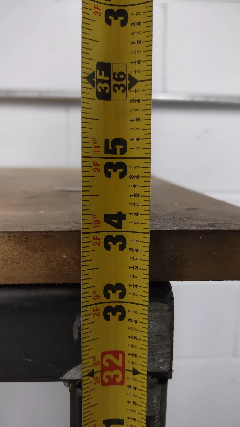 Industrial style shop table with steel frame and interchangeable tabletop. Good for garage or warehouse business.