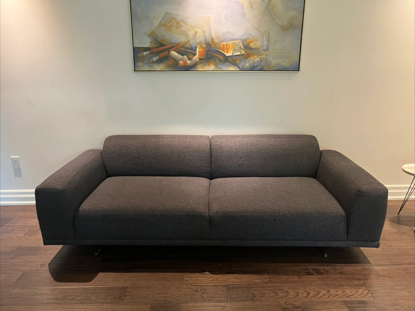 Comfortable grey two-seater sofa. Features a boxy shape and cushioned back. A perfect addition to your living room, where you can curl up with a good book. Very sturdy.