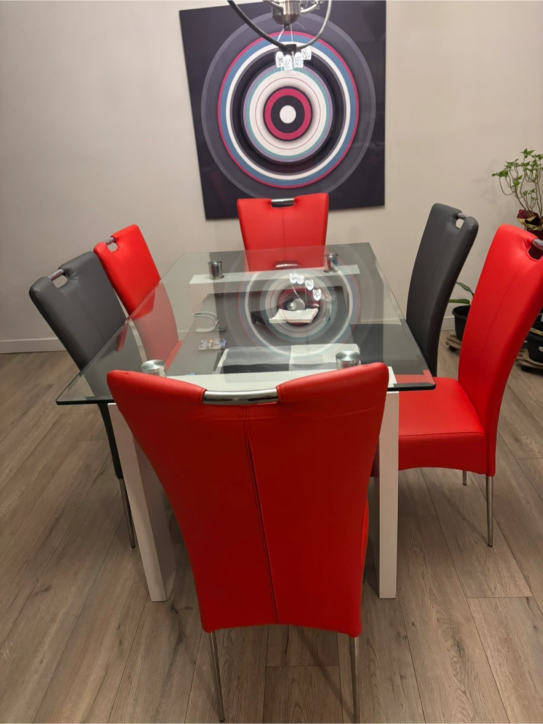 A modern glass-top dining table with six chairs. The table has a sleek white base and chrome legs. It comes with three red and three dark grey chairs, upholstered in faux leather with chrome accents. This set's stylish design will complement any contemporary dining space!
