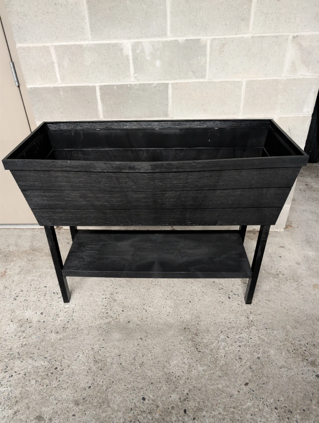 This black raised planter box features a slatted wood-look design and a convenient lower shelf. It's perfect for adding greenery or a herb/veggie garden to your patio or balcony.