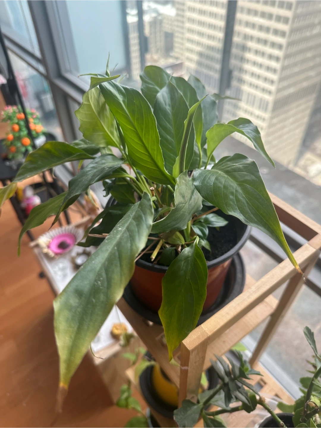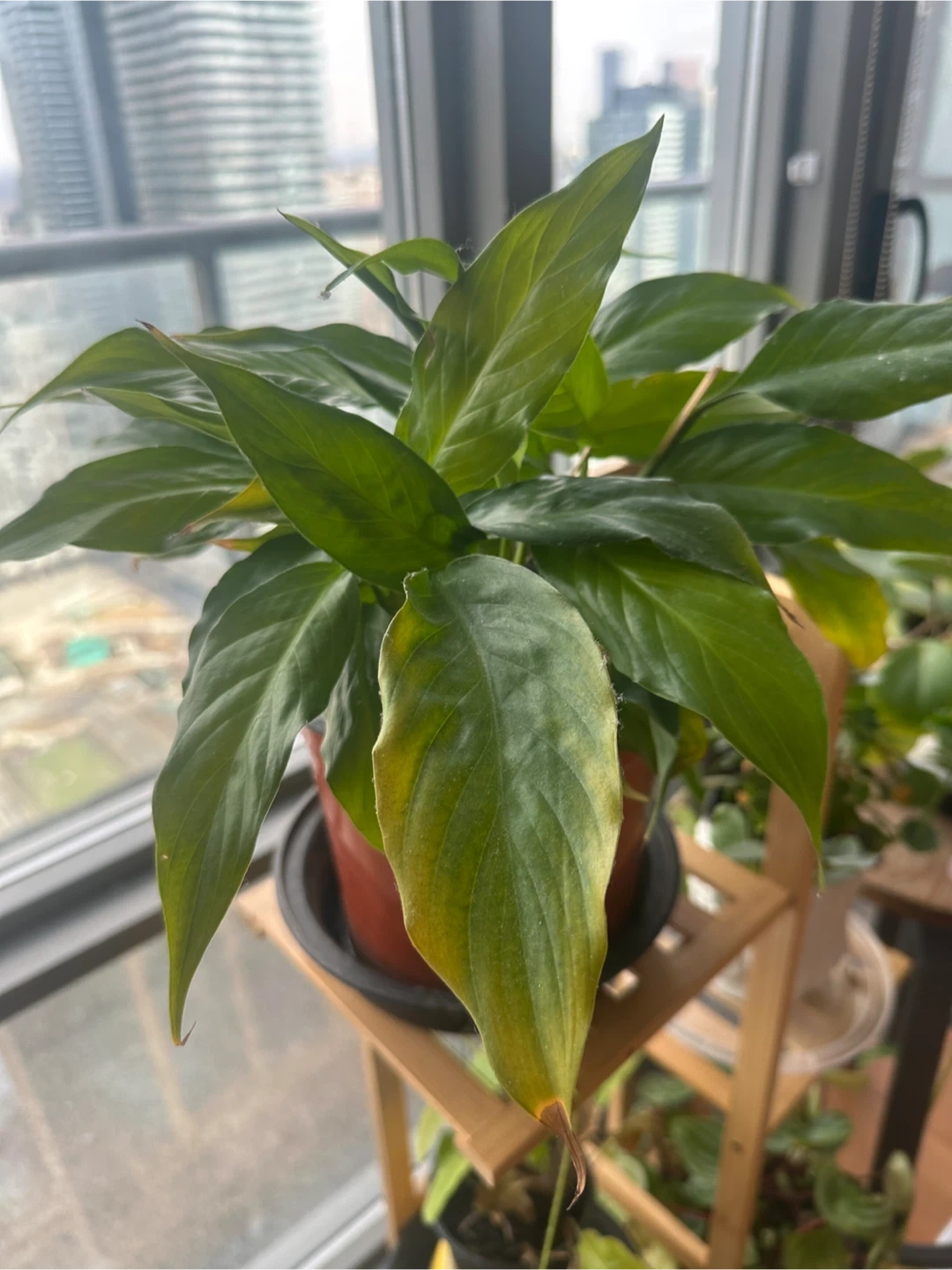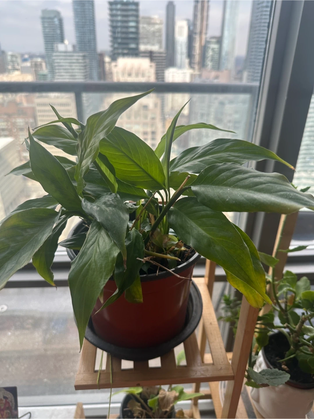 This is a peace lily plant in a terracotta-coloured pot with a saucer. It has lush green leaves. Peace lilies are known for their air-purifying qualities.