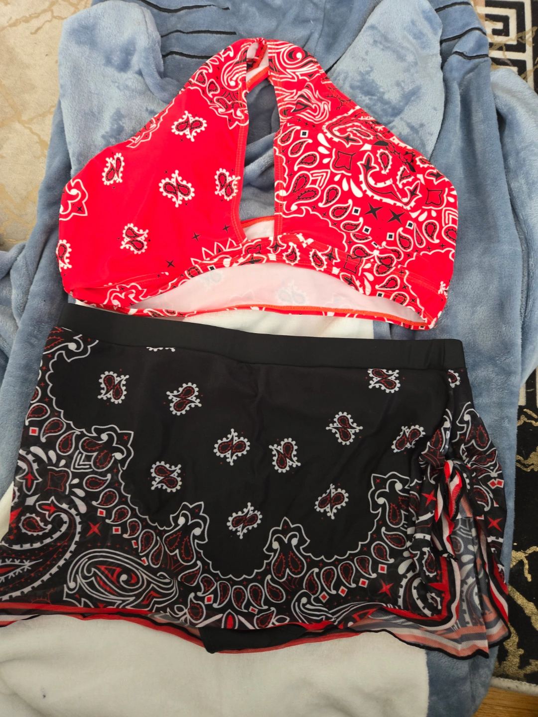 Bandana print bikini set. Halter top with a tie in the back. Matching skirt-like bottoms. You will feel relaxed and ready to go out for a day at the beach. pick in north york i can delivery for a small fee.