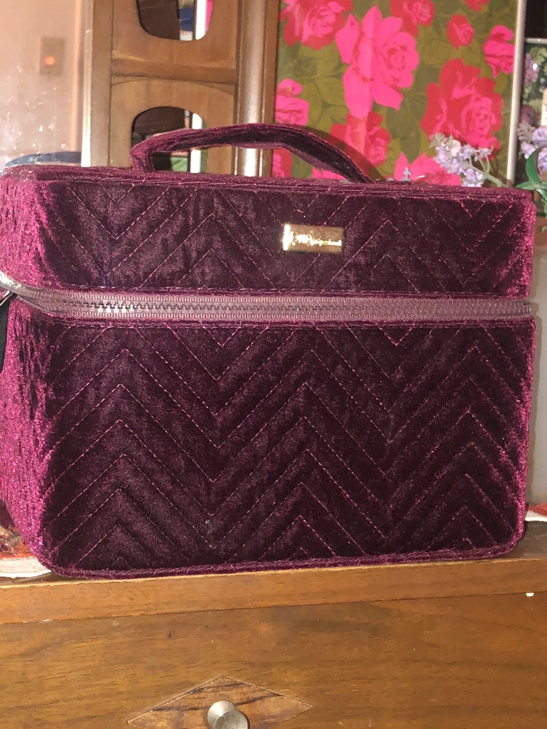 burgundy velvet cosmetic or jewelry case. Features a quilted chevron pattern and gold-toned zipper. Top handle included.