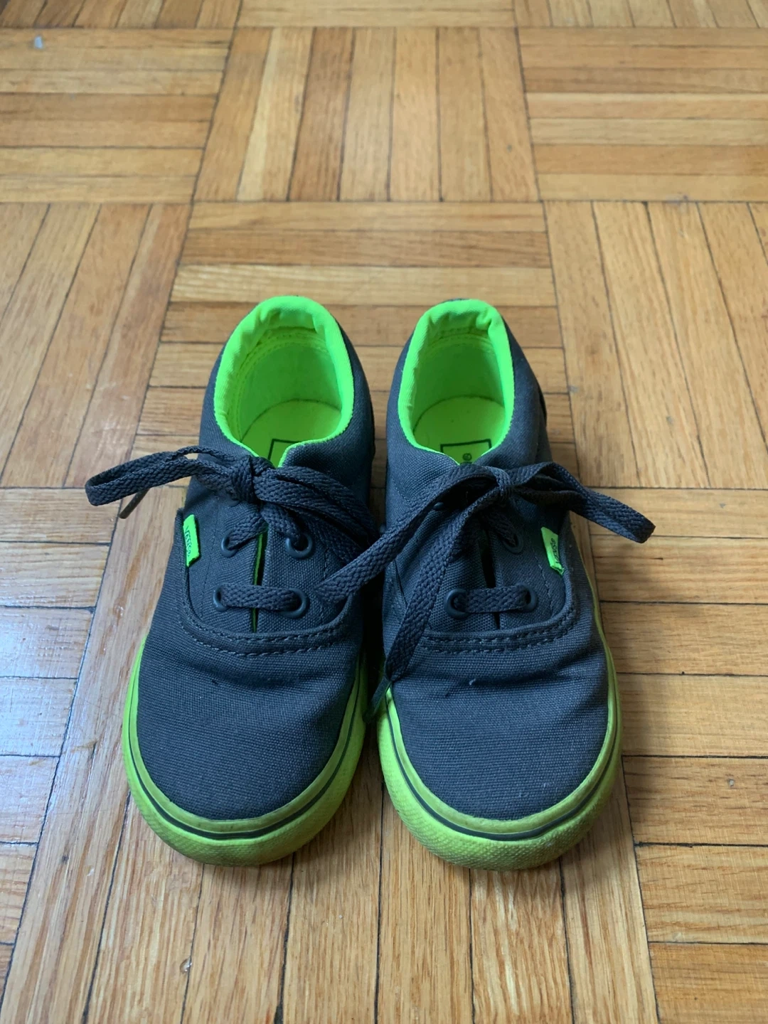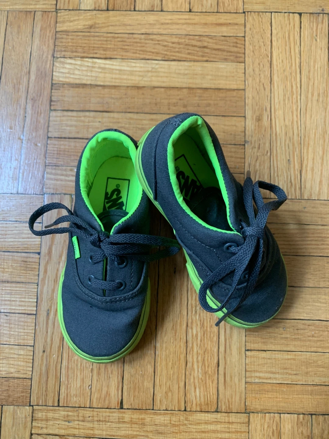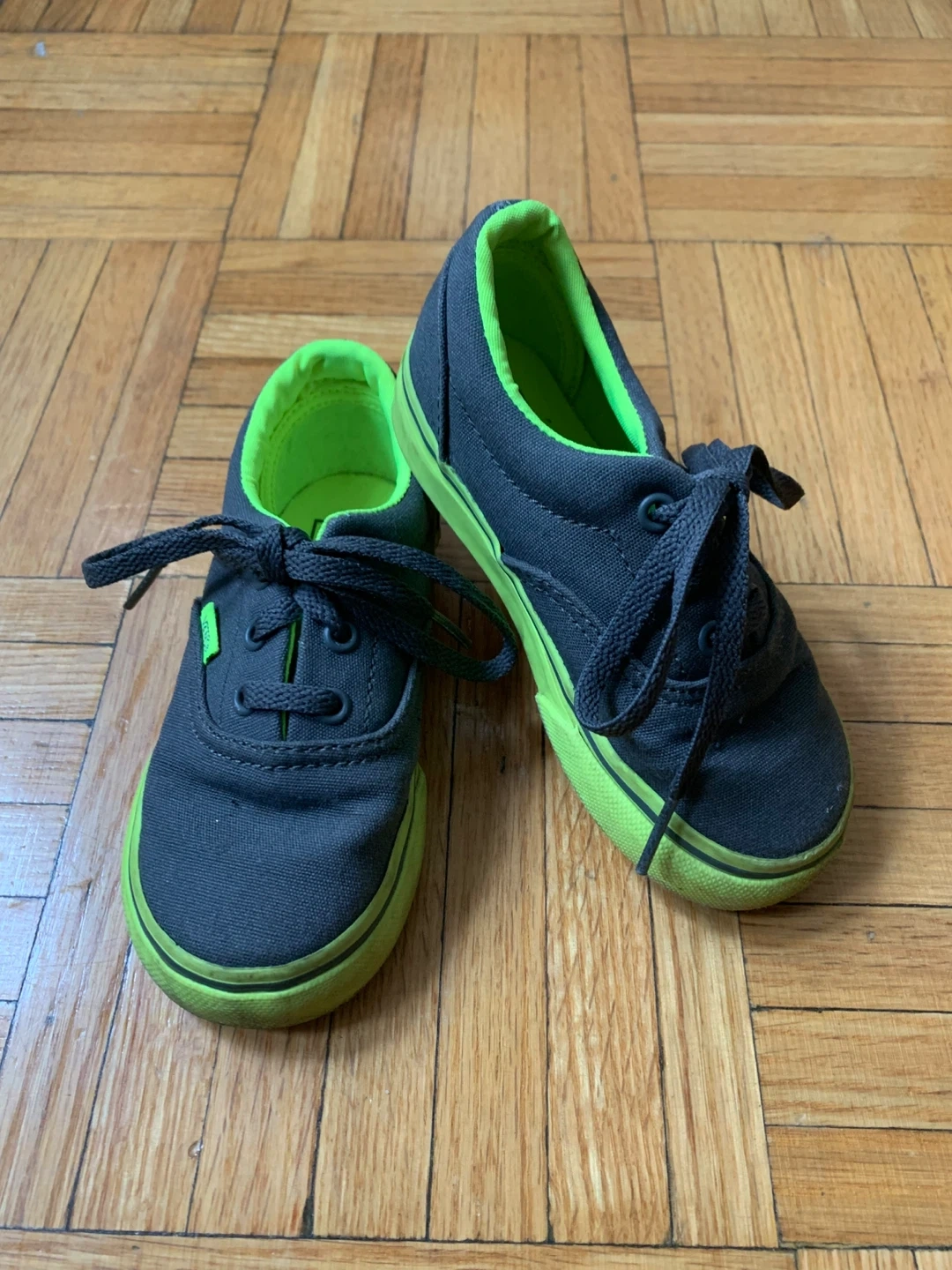 These are Vans Off The Wall sneakers in a Toddler size. They've got a grey canvas upper with bright green accents on the lining and sole. Laces are black. These kicks are ready for everyday wear!