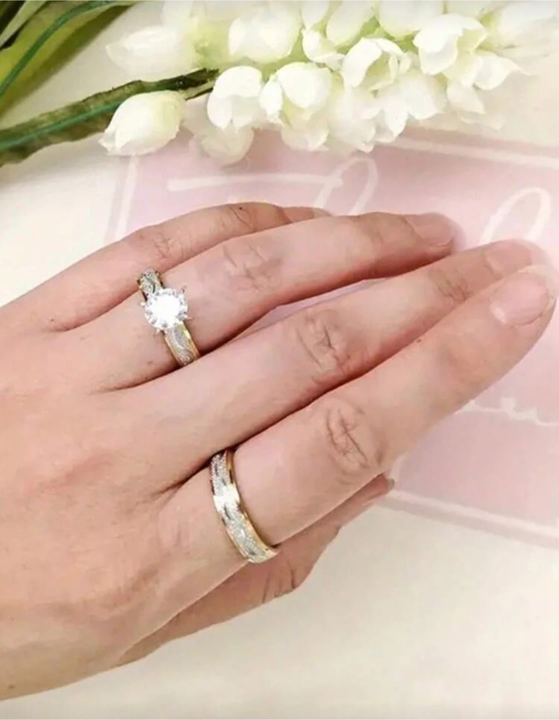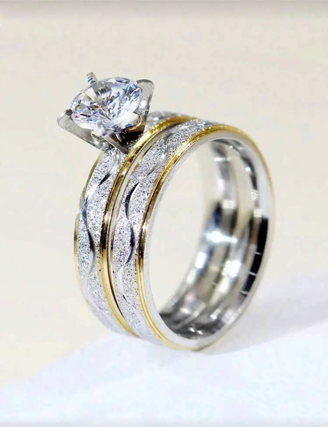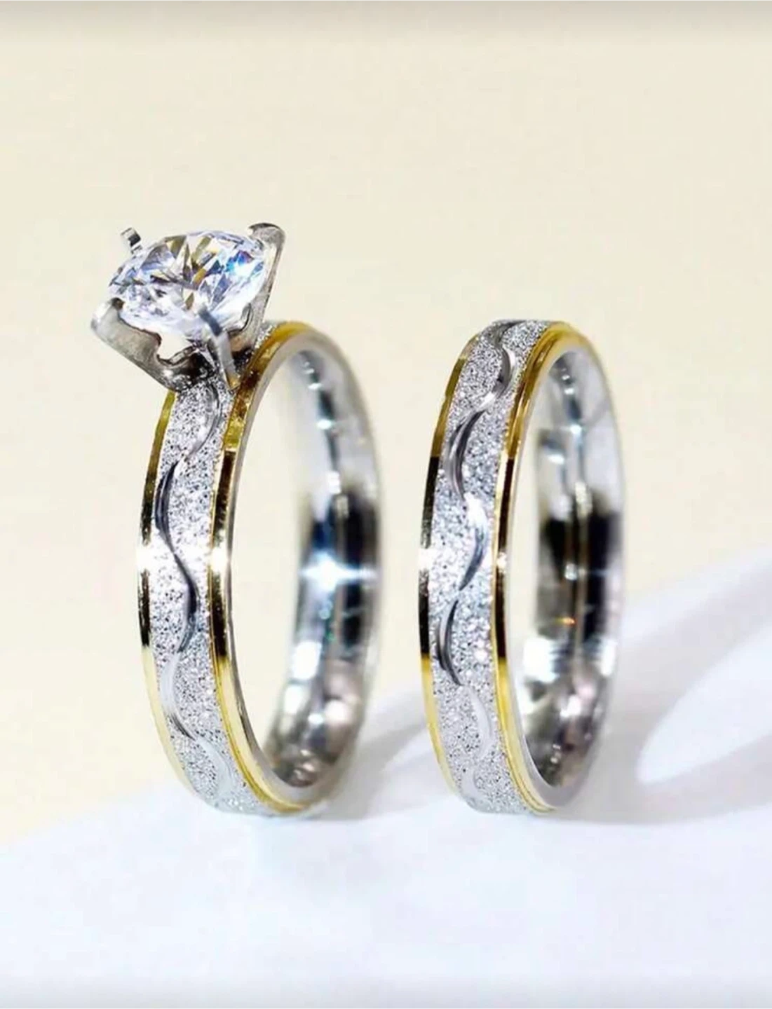 This is a two-piece wedding ring set featuring a main ring with a clear stone and a matching band. Both rings have a textured silver-toned finish with gold-toned trim along the edges. It's a beautiful set!
