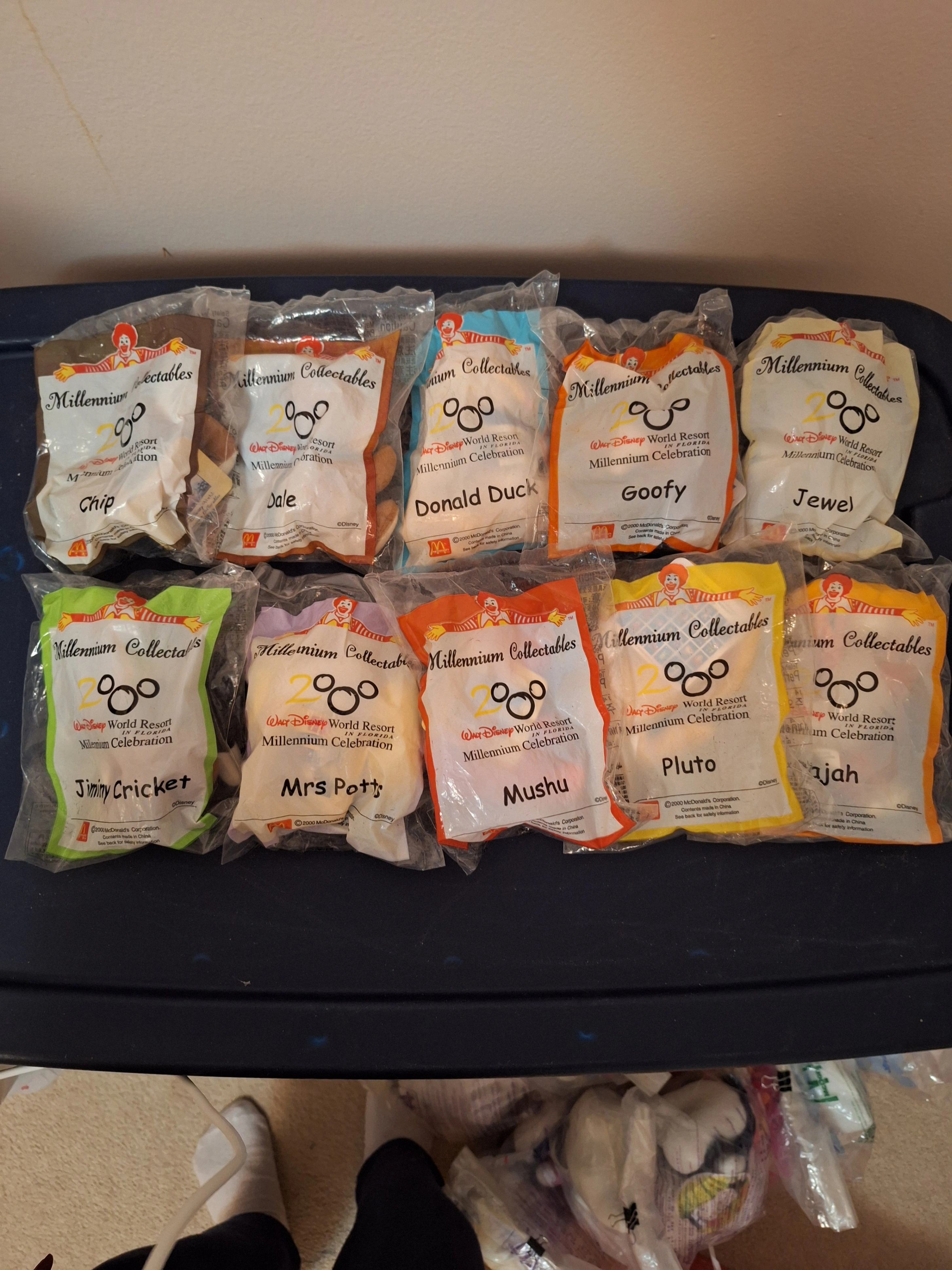 A set of McDonald's Disney Millennium Celebration collectables. They are all still sealed in their original packaging! The set includes Chip, Dale, Donald Duck, Goofy, Jewel, Jimmy Cricket, Mrs Potts, Mushu, Pluto, and Rajah