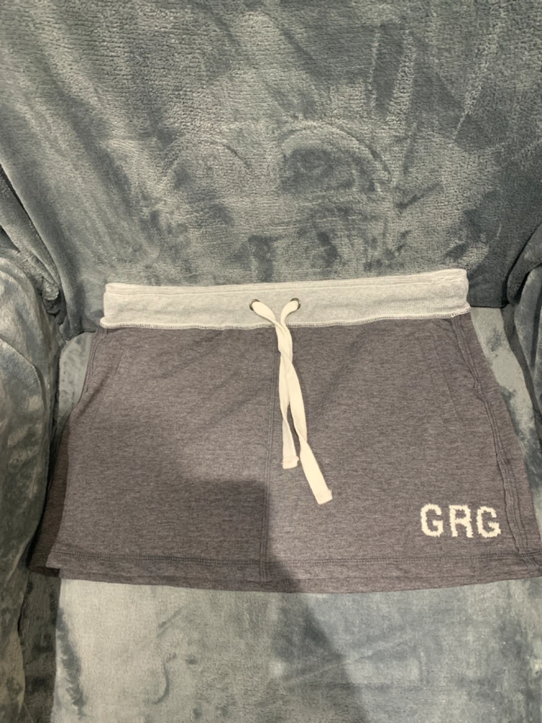 Grey Garage sweat skirt in size medium. Elastic waistband with a drawstring. Features "GRG" embroidered on the front.