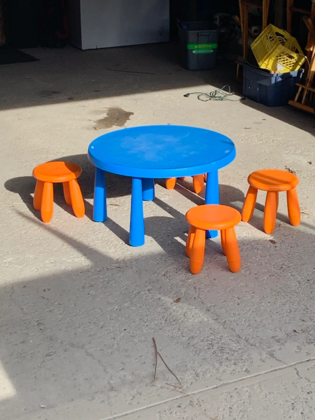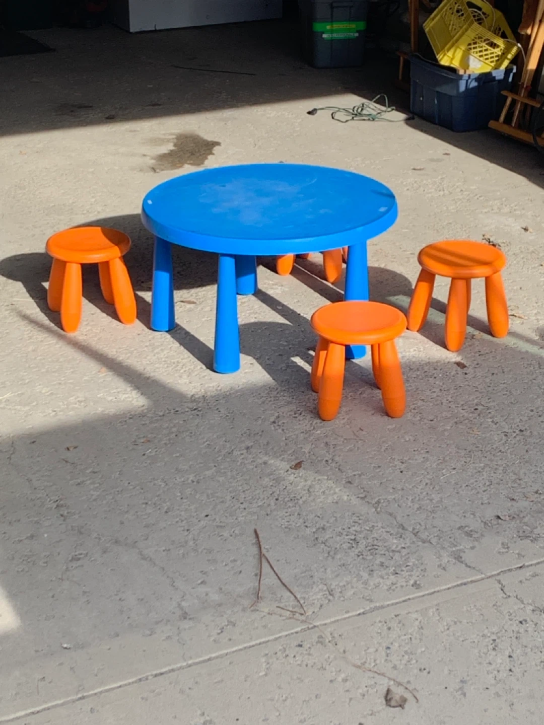 This is a fun blue kids table with four orange stools. It's perfect for playtime or snack time. The set is made of durable plastic, suitable for indoor or outdoor use.