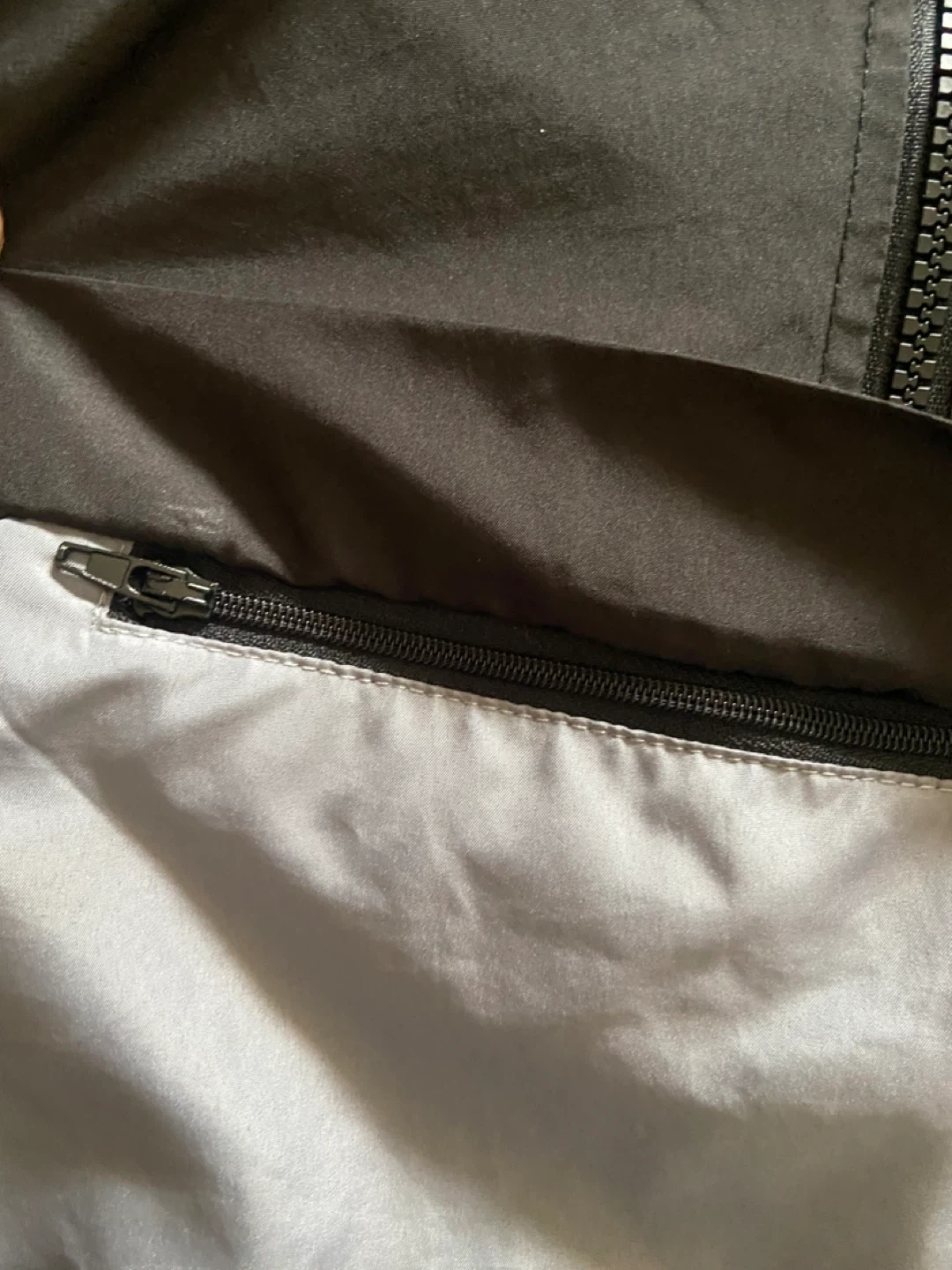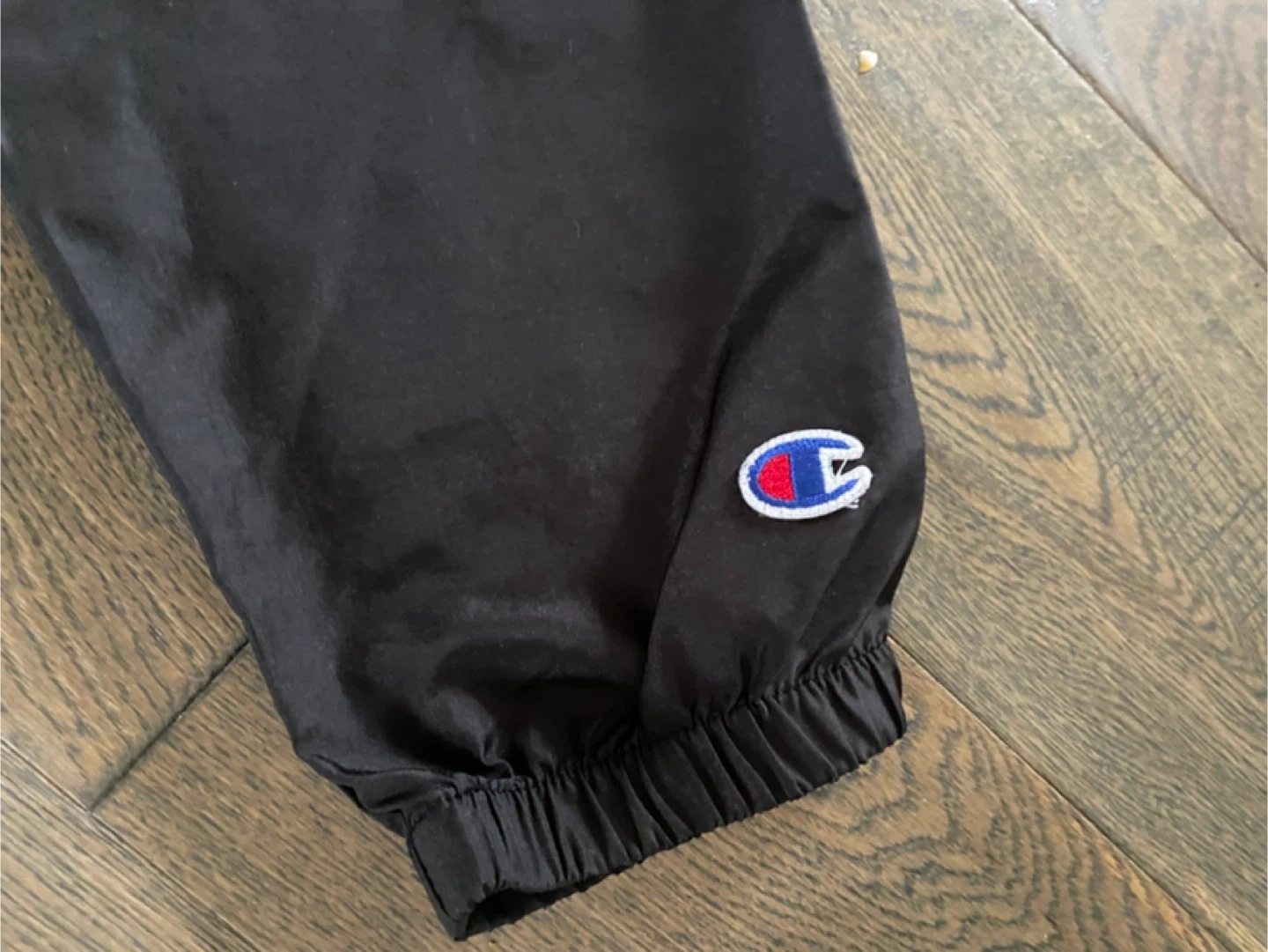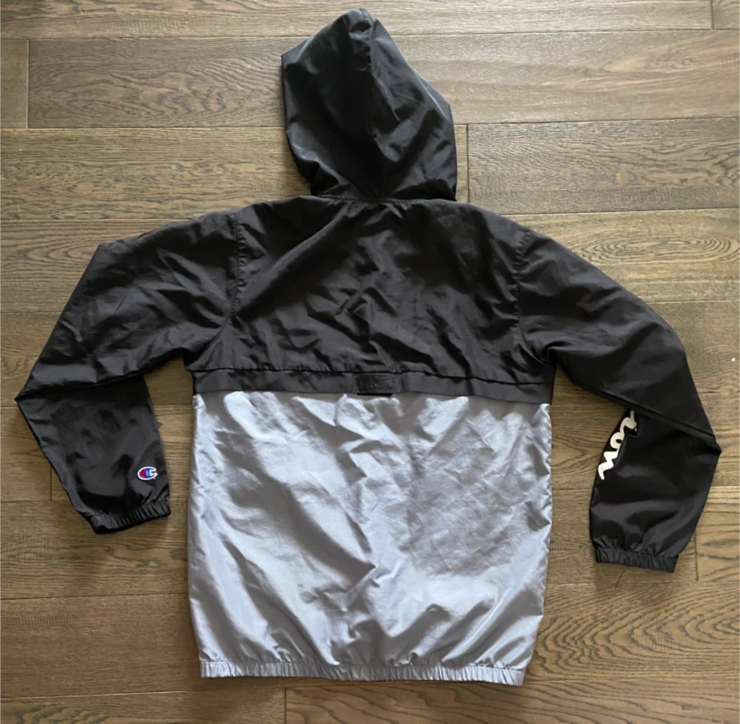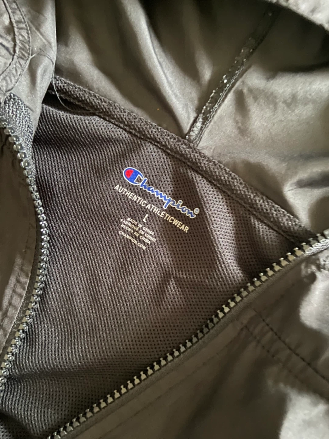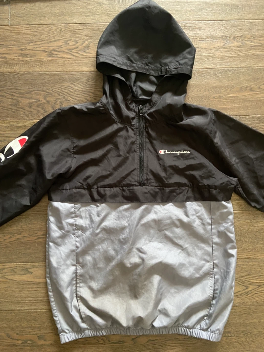 This is a black and grey Champion windbreaker jacket in youth size large