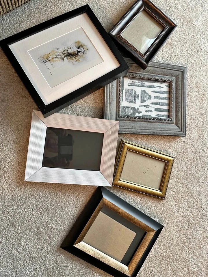 Assorted collection of six picture frames in various styles and finishes. Set includes gold frame (8”x6”), mixed brown frame (8”x6”), black and gold frame (10”x8”), light grey frame (9.5”x7.5”), black frame with white matting (11”x9”), and dark grey frame (11.5”x9.5”). Frames are made of wood and plastic materials with glass inserts.