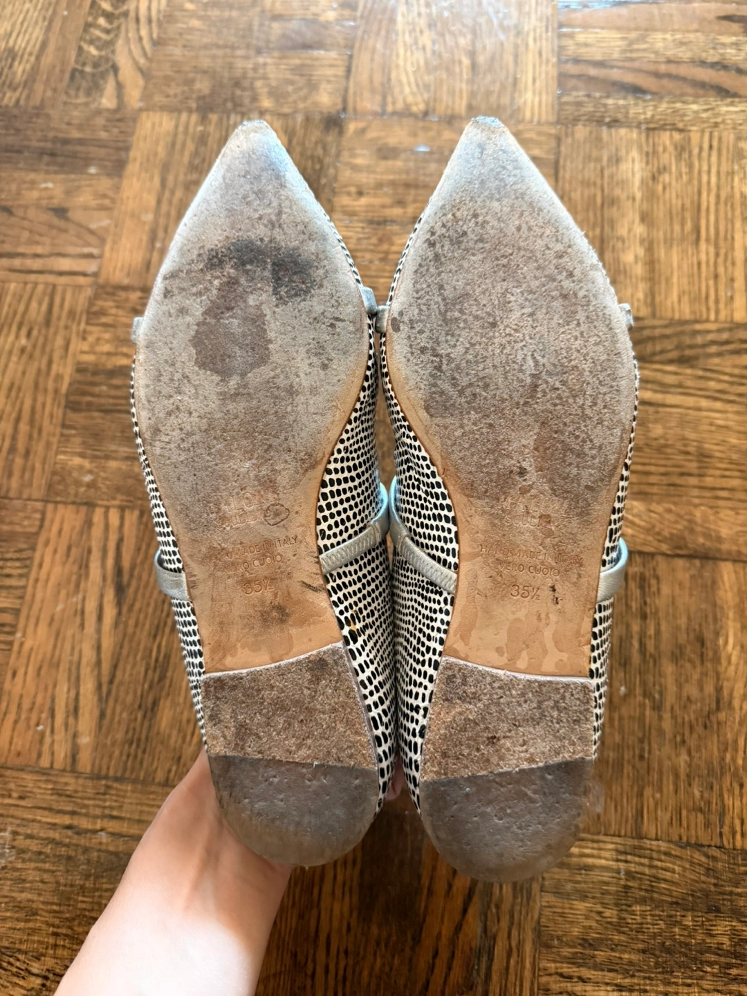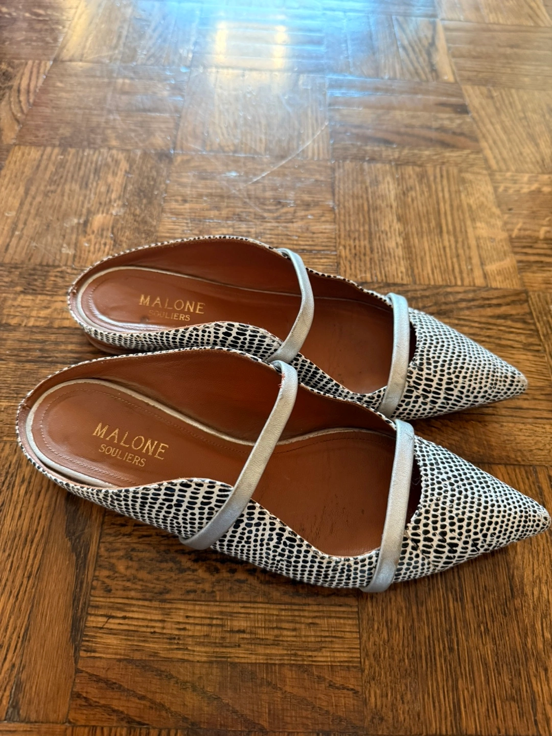 These are a pair of classic Malone Souliers pointed-toe mules in a size 35.5 EU