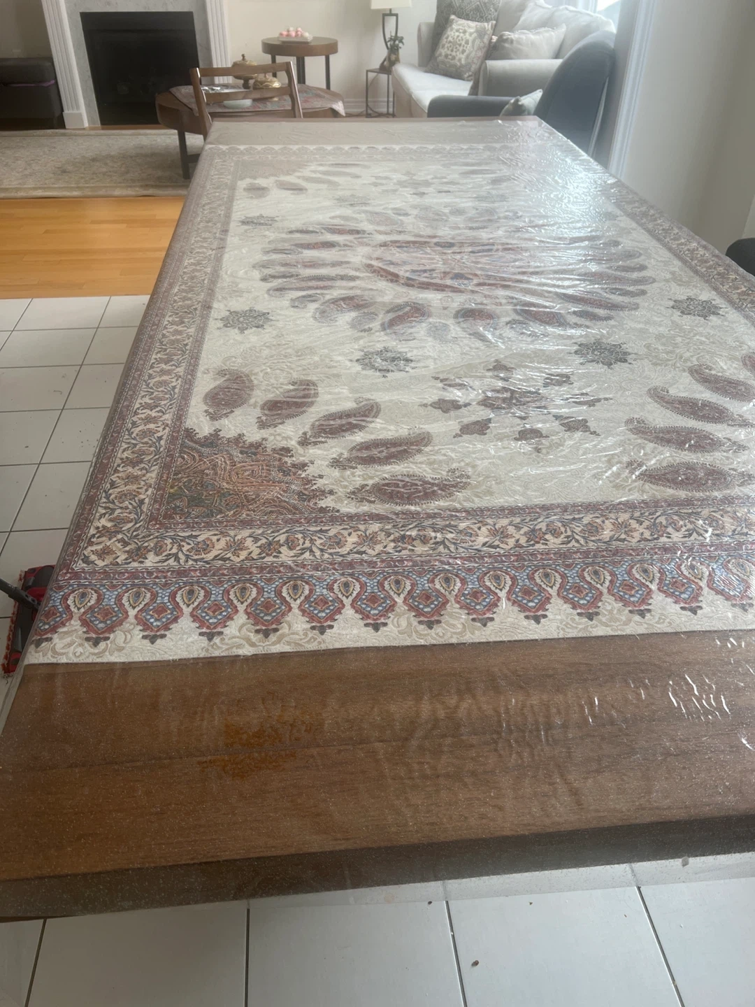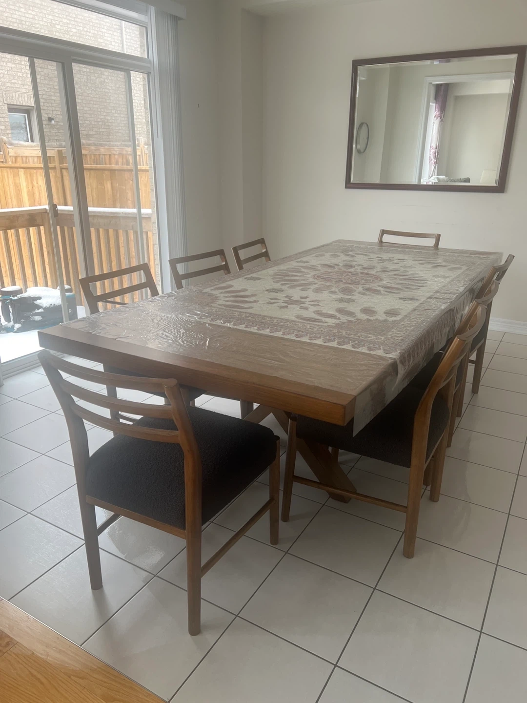 A sturdy wooden dining table with a decorative tablecloth. It comes with eight matching chairs featuring dark upholstered seats. This set is perfect for family meals and gatherings.