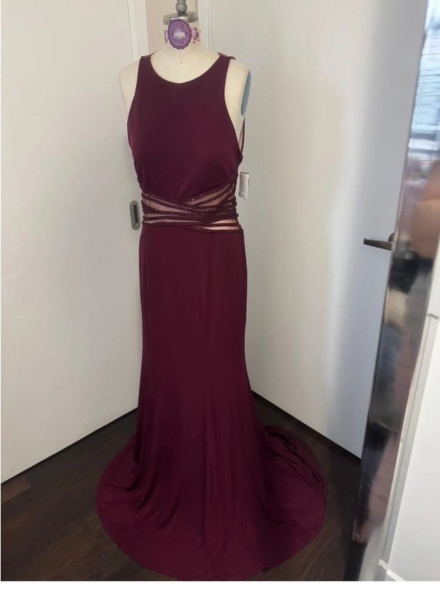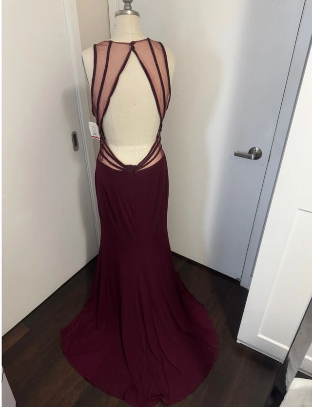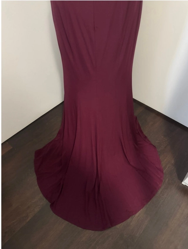 Beautiful Merlot wine coloured special occasion evening dress, ladies size 14. It's brand new with tags on and has never been worn. The dress features a stunning open back. Please note, it is missing two small buttons that go at the back of the neck to secure the dress. This requires a small mend, which is why it was purchased on sale. Two hook and eye closures from Dollarama would be an easy fix. Selling because I've lost weight and it no longer fits. Pick up is in the lobby of my condo in Scarborough, near Finch and McCowan. Check out my other ads for more ladies' dresses!