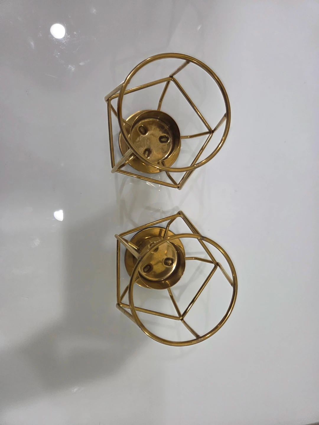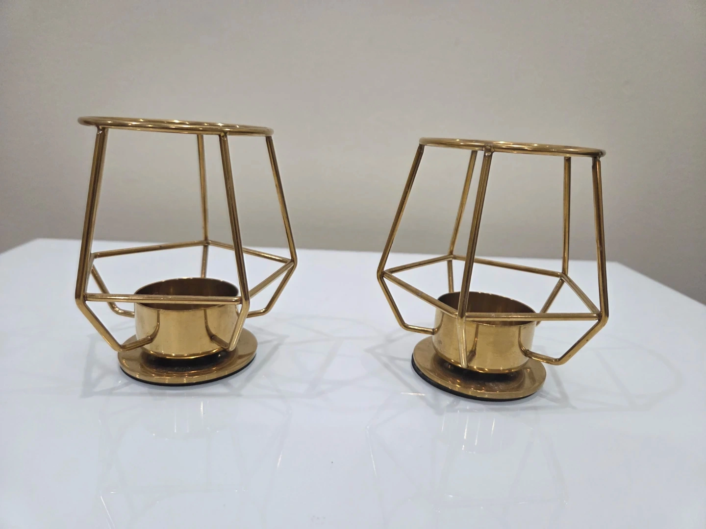Stylish set of two gold metal geometric candle holders. These feature a modern design that adds a nice touch to any table. Perfect for small tealight candles.