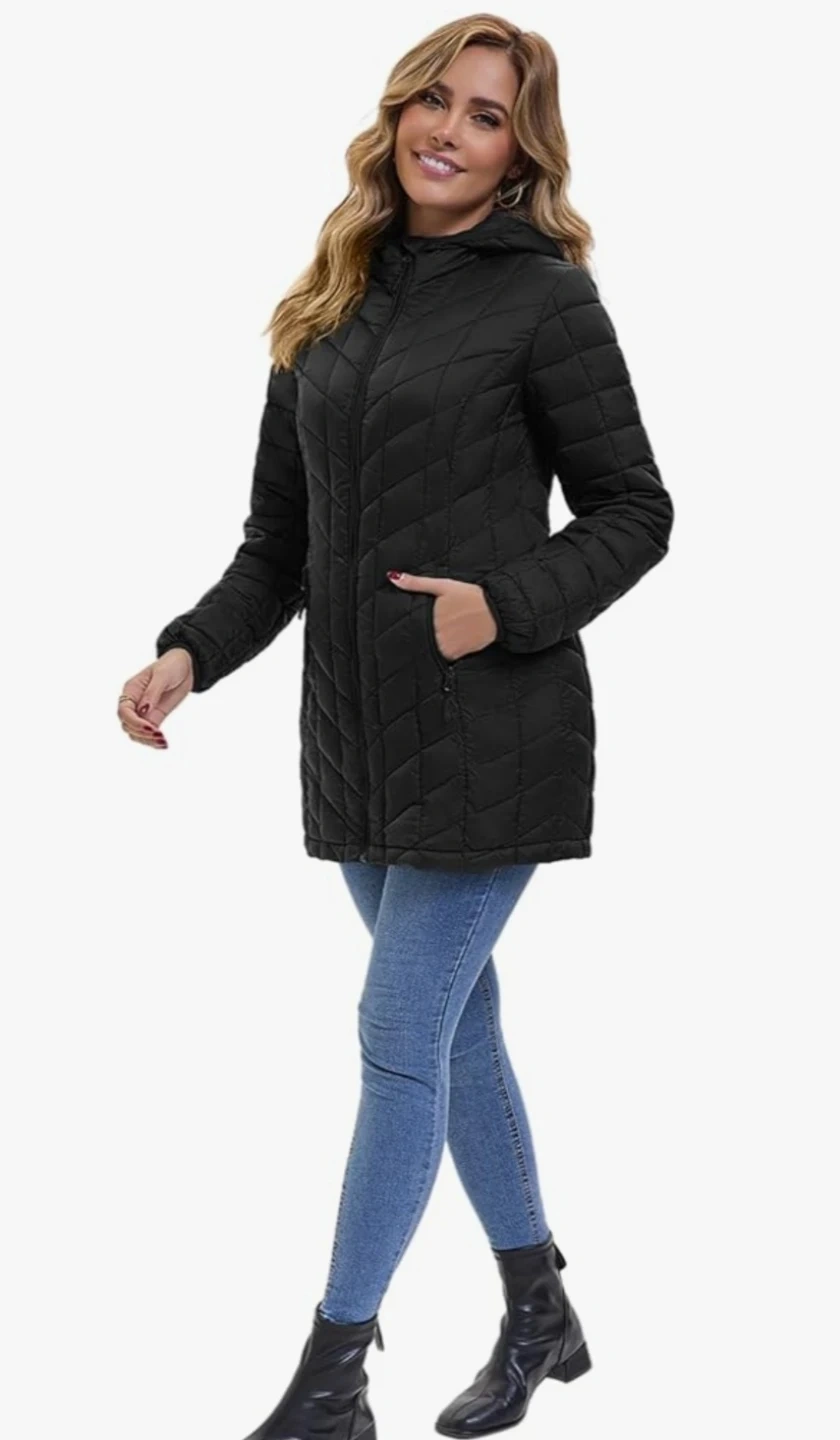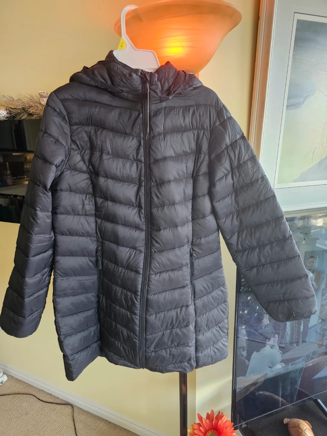 Selling a brand new lightweight packable puffer coat in black. It features a hooded design, zippered pockets, and elastic cuffs. It's perfect for layering or wearing on its own during milder weather! There's also an inside pocket for your valuables