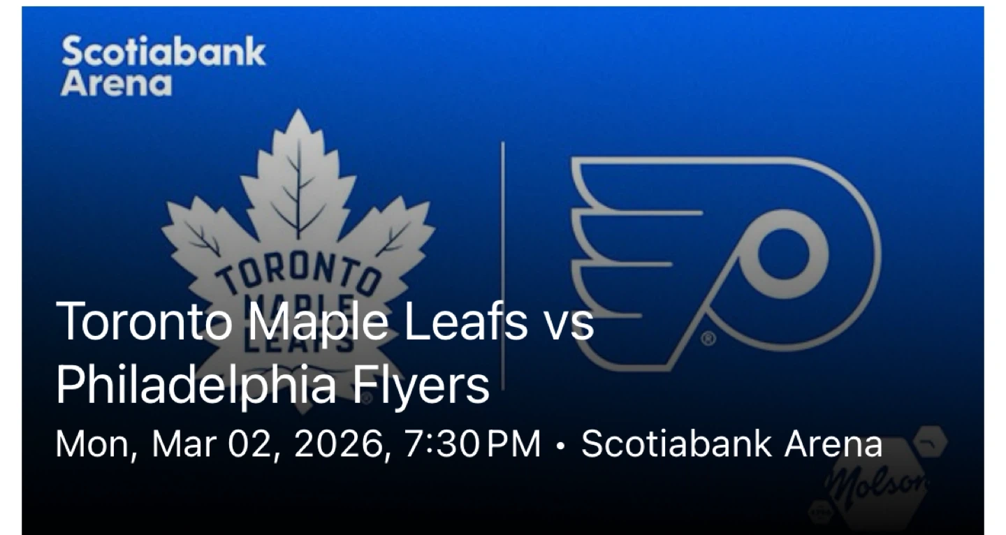 2 Tickets to the Toronto Maple Leafs vs Philadelphia Flyers game. It's happening Mon, Mar 02, 2026, at 7:30 PM at Scotiabank Arena. A great game for hockey fans! Unable to attend food and non alcoholic drinks are included in these box seats. Please contact for more information