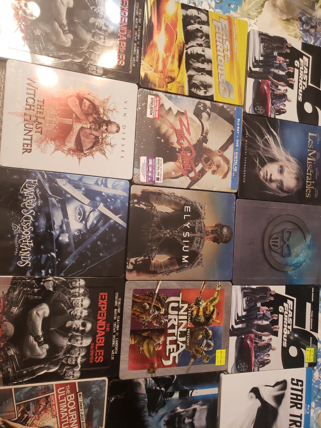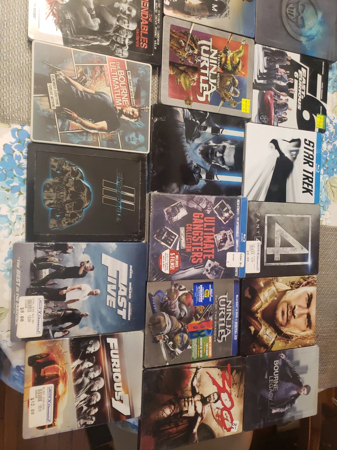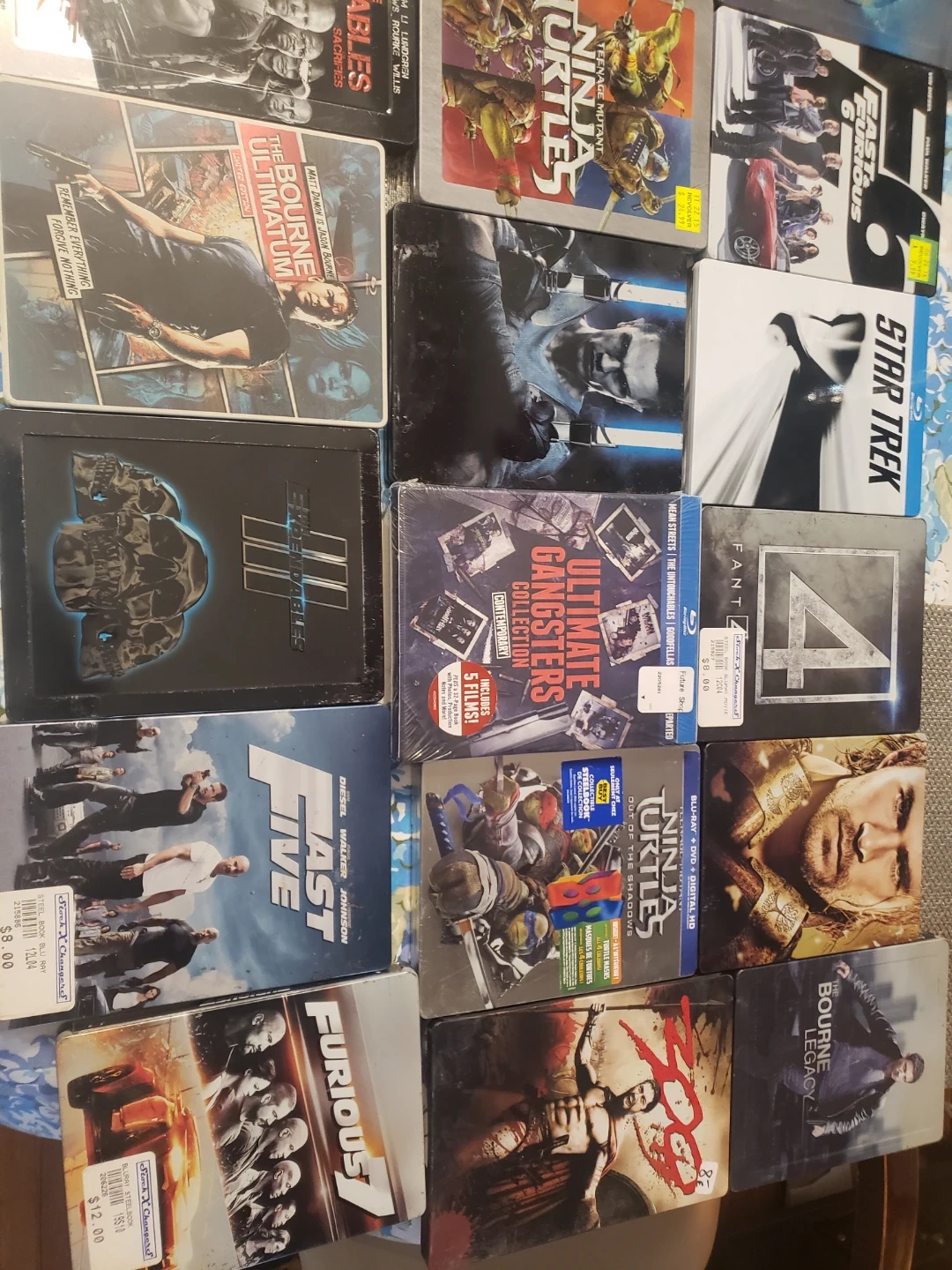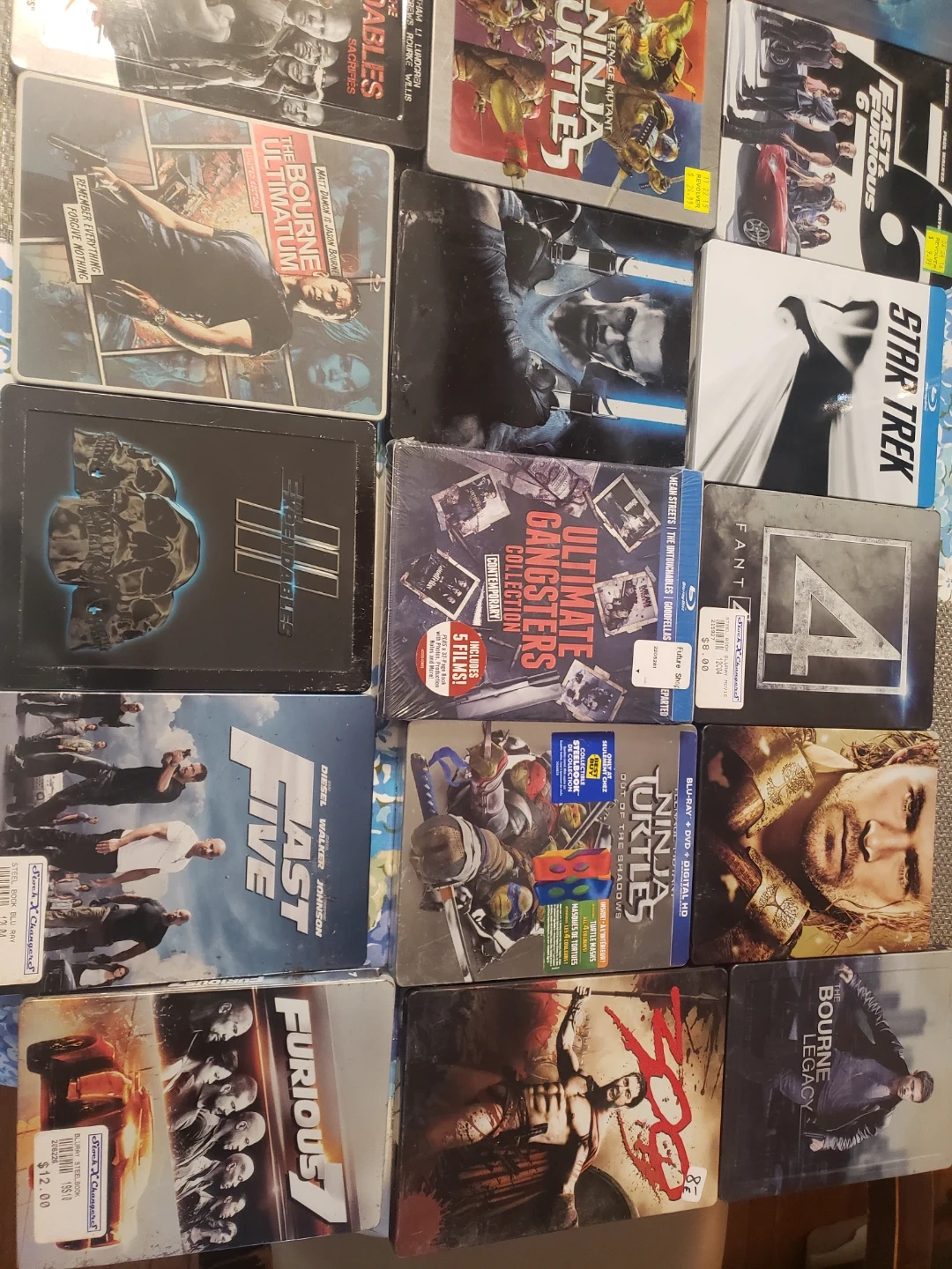 This is a collection of various Blu-ray movies in Steelbook cases. Includes titles like The Bourne Ultimatum, Fast Five, Star Trek, and more. Great for movie collectors!
